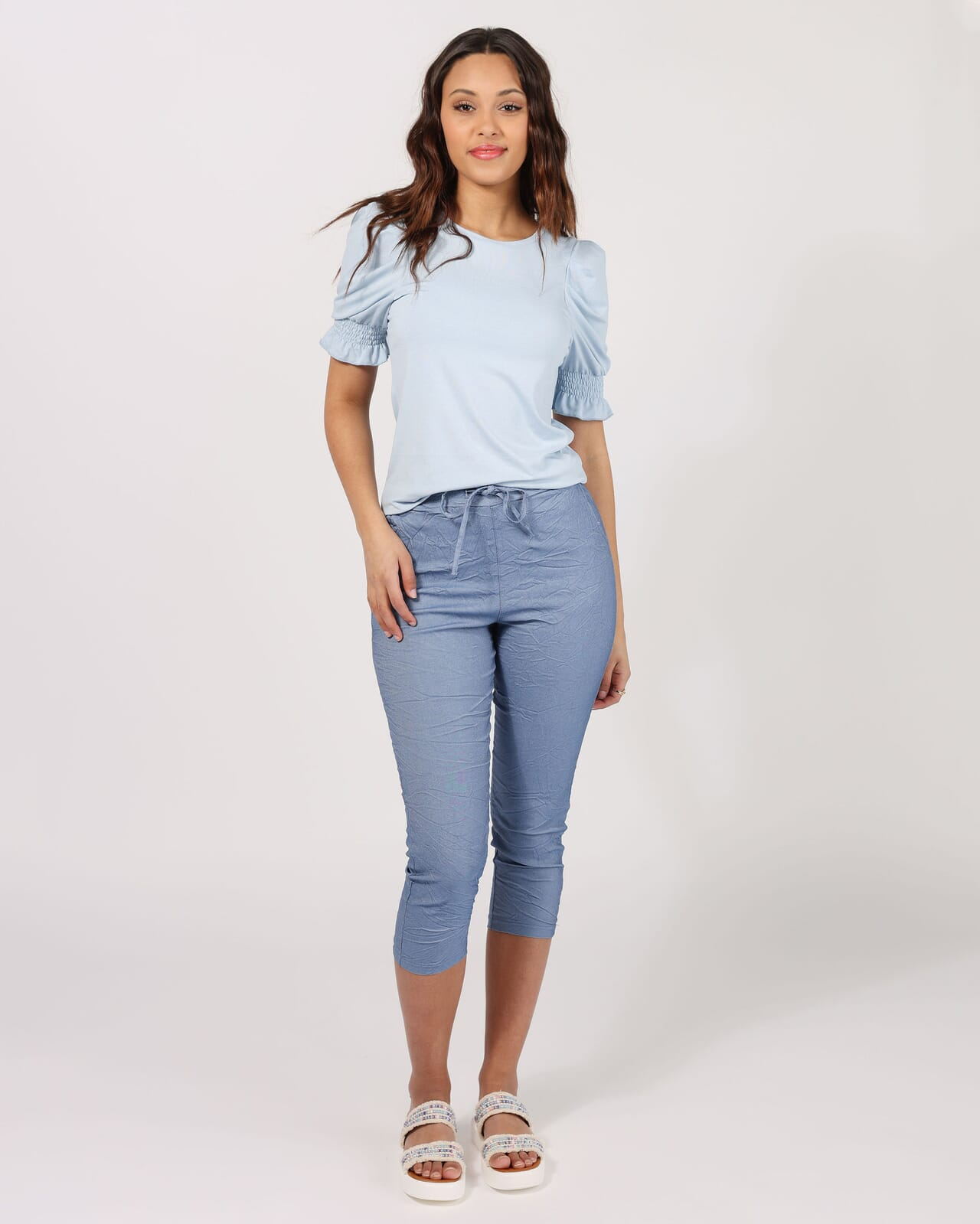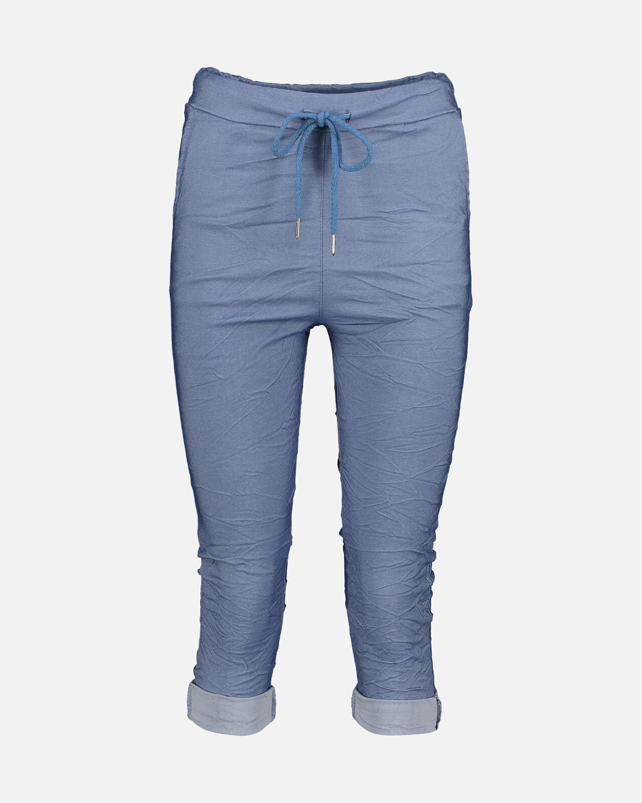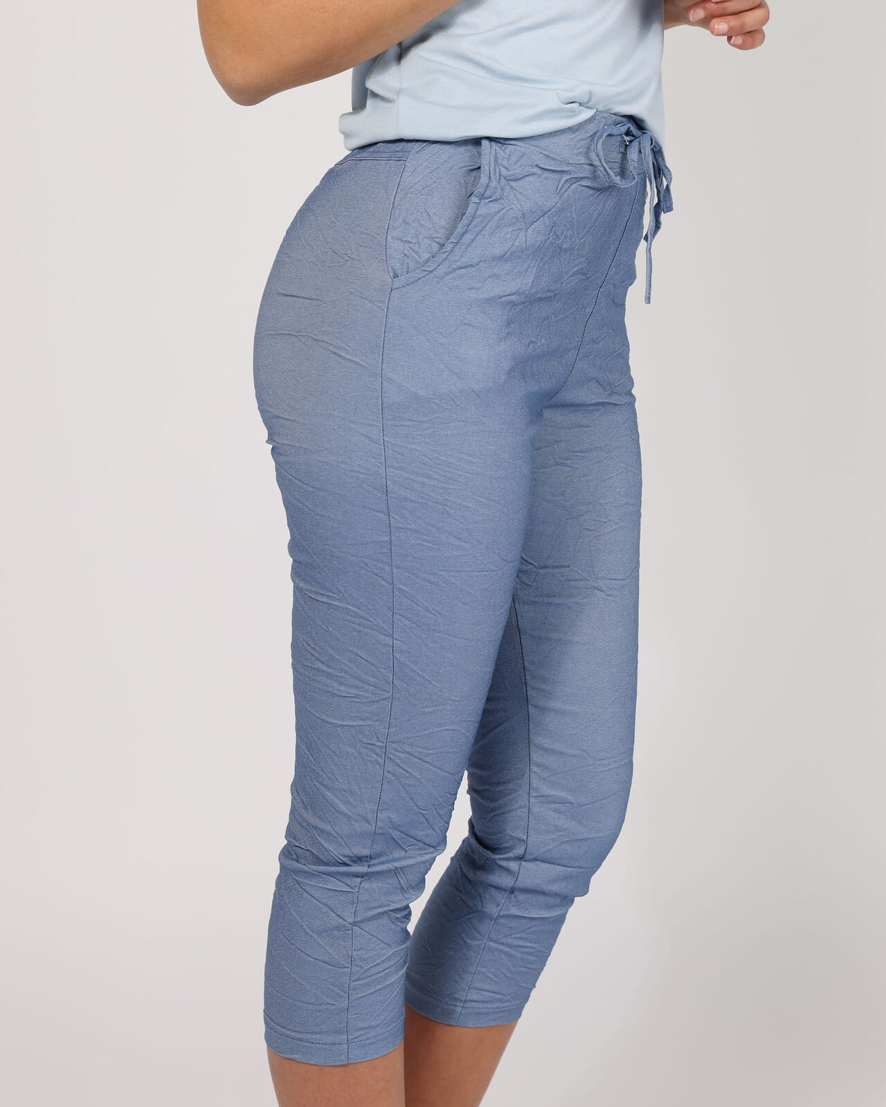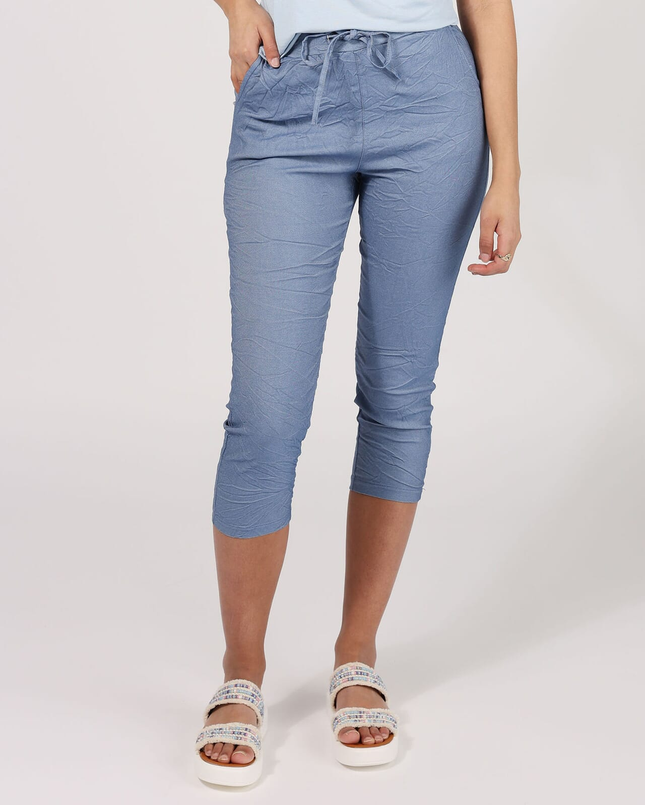 Behagelig capribukse i myk viskoseblanding. Den har en smal passform med god stretch i stoffet. Strikk og knyting i livet. Stikklommer i sidene. Stoffet skal ha en "rynkete" look. Brettekant nederst som ikke er sydd fast.