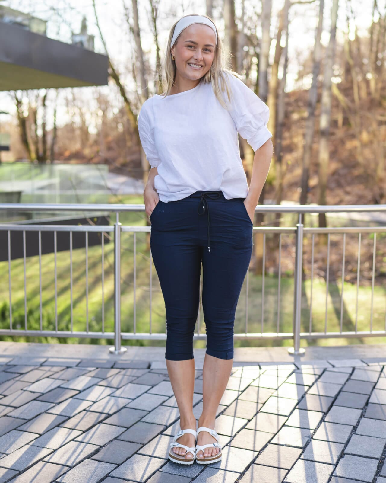 Behagelig capribukse i myk viskoseblanding. Den har en smal passform med god stretch i stoffet. Strikk og knyting i livet. Stikklommer i sidene. Stoffet skal ha en "rynkete" look. Brettekant nederst som ikke er sydd fast.