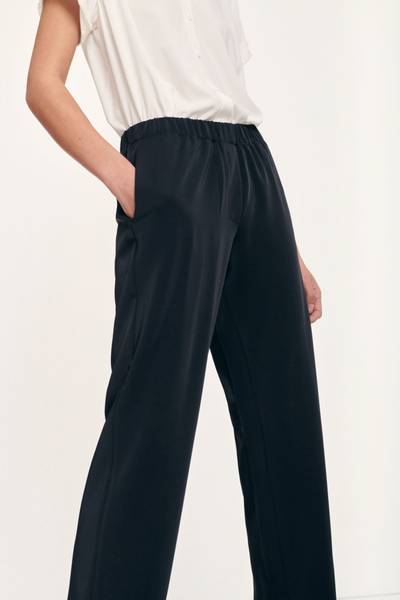 Myk og behagelig bukse med vide ben fra Samsøe Samsøe. Strikk og snøring i livet. Stikklommer i front. Normal i størrelsen.
