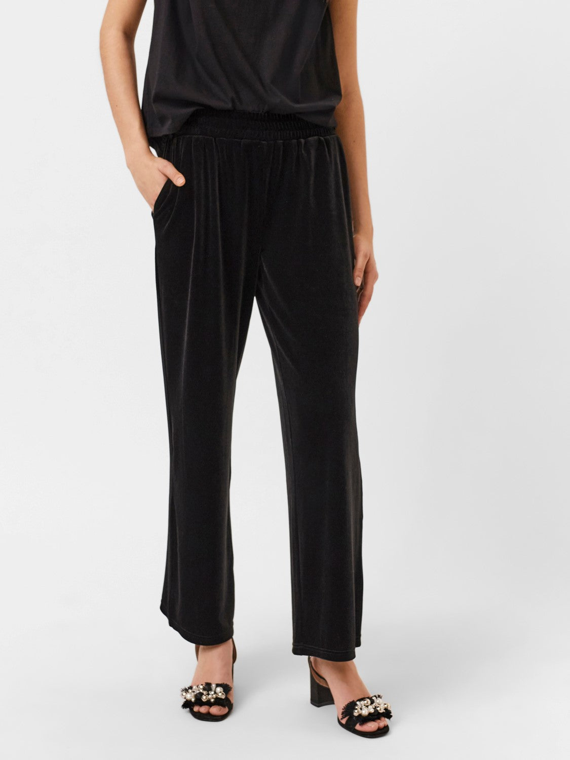 Velour pants. - High-waisted. - Elastic waistband. - Wide legs. - Two side pockets. - Made with recycled polyester. - Regular fit. - Frontlength: 58 cm in a size S. - The model is 175 cm tall and wears a size S. High-waisted velour pants with an elastic waistband, wide legs, and two side pockets, made with recycled polyester. Style these comfy pants with an oversized shirt and some chunky sneakers for a cool and comfortable everyday look. MADE WITH RECYCLED POLYESTER This product is made with recycled polyester. Recycled polyester saves natural resources and reduces the amount of waste.