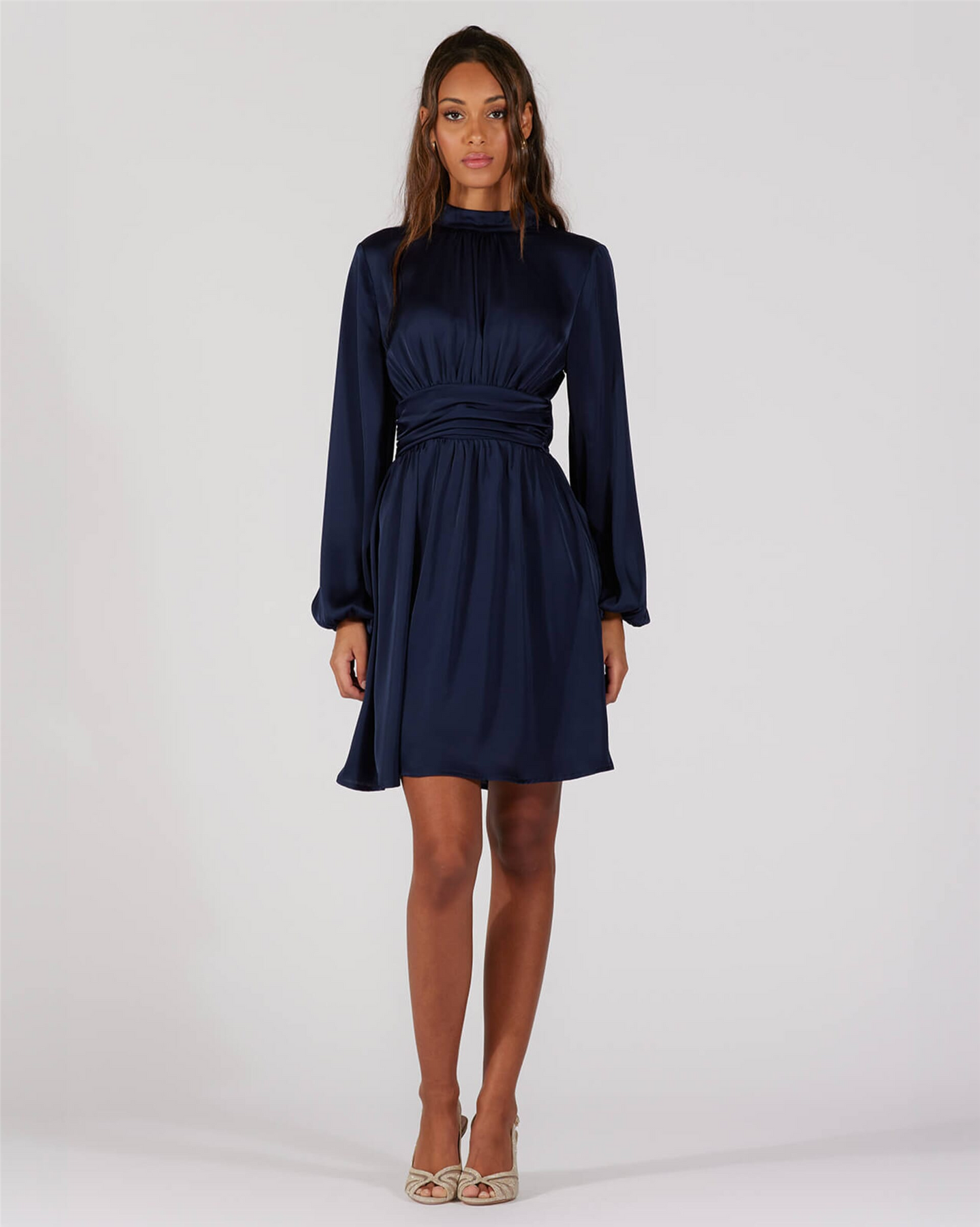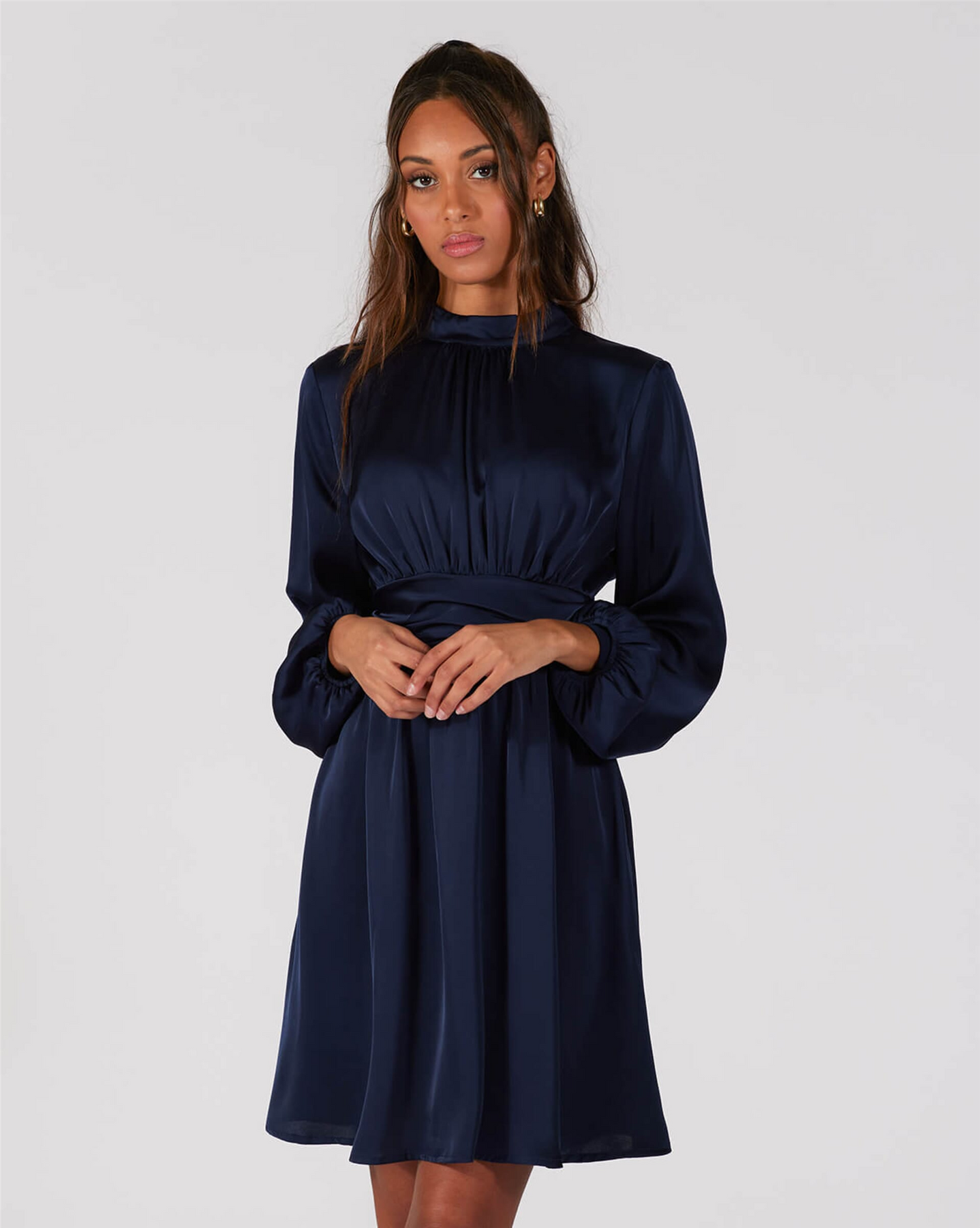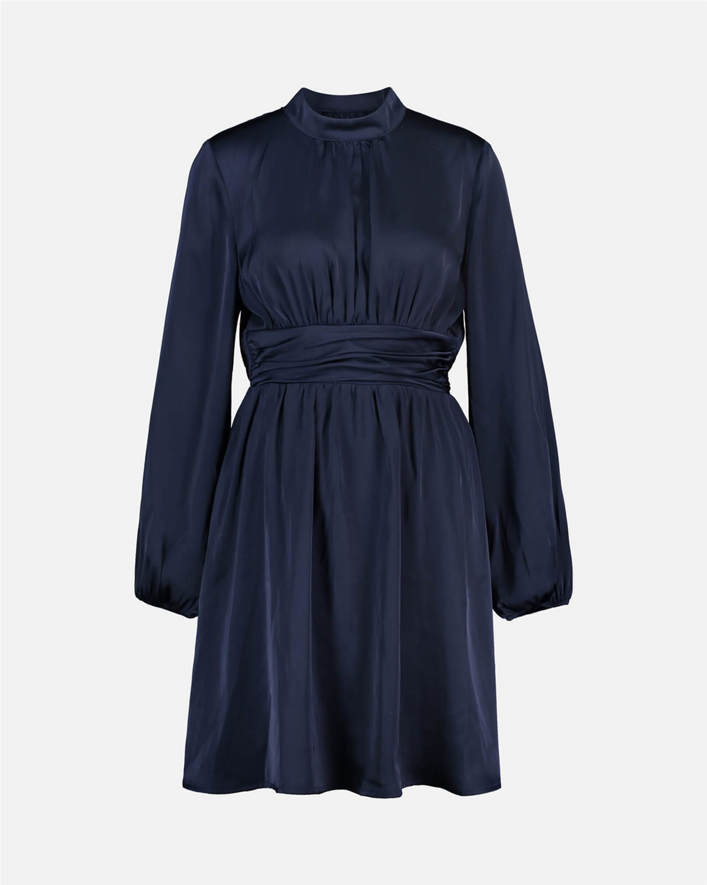 Kjole i myk sateng med en glatt og blank overflate. Høy hals med knapper i nakken. Lange ermer med legg på skuldrene og tynn strikk nederst. Markert midje med drapering foran, og tynn strikk i ryggen. A-formet skjørt. Mykt fòr inni.