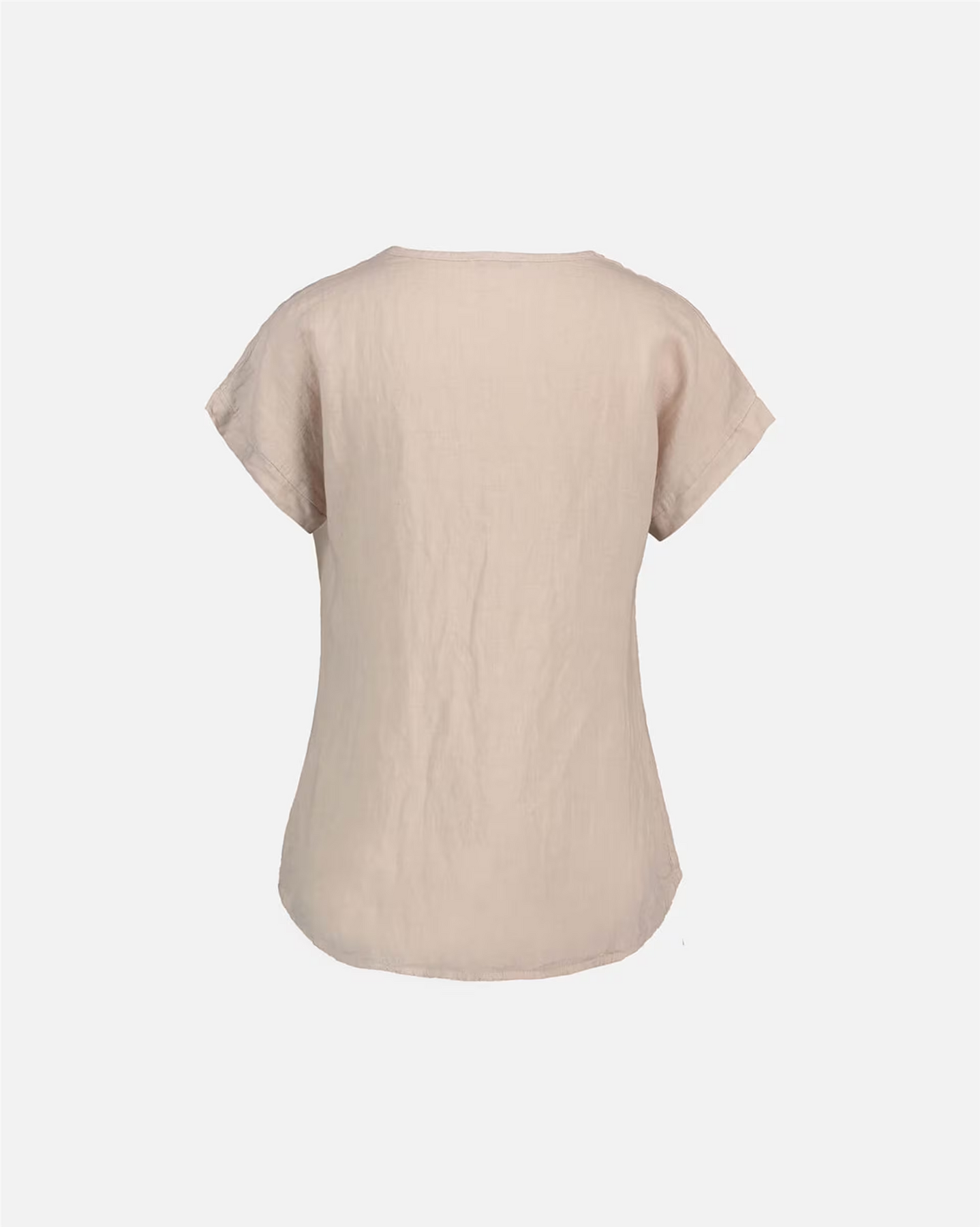 Topp i lin- og viskoseblanding. Denne har en litt teksturert overflate med grov lin-look, og stoffet er uten stretch. Den har v-hals, korte ermer og er noe lenger bak.