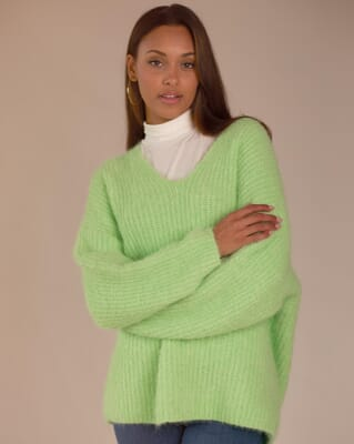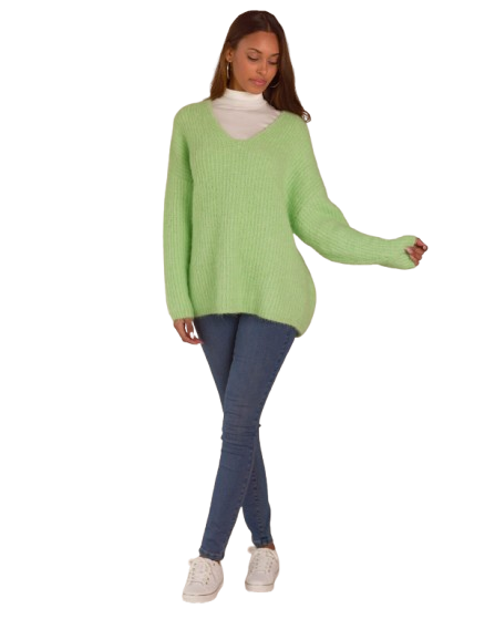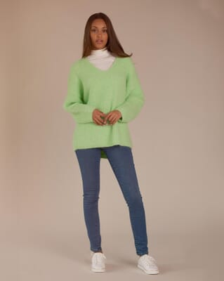 Deilig og myk strikkegenser med en fin lyserosa farge. Den har flatterende V-hals. Lange ermer med lav skuldersøm. Genseren har en ledig passform.