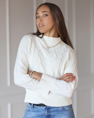 Denne genseren i elegant offwhite farge passer hele året. Den vil varme deg på kjølige kvelder og gi deg en avslappet look på dagtid.