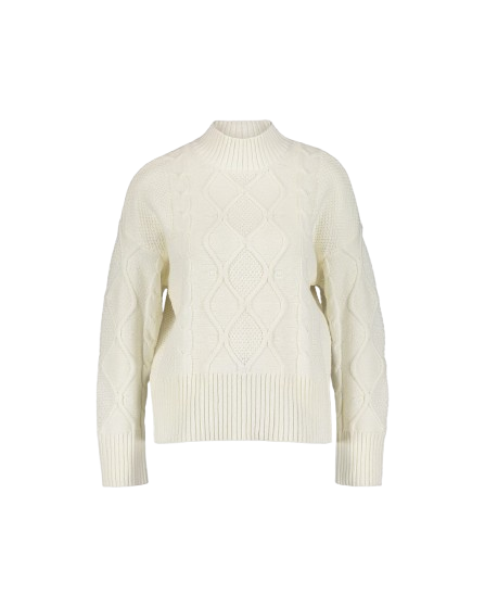 Genser i myk bomullsblanding med kjempefint strikket mønster. Den har litt høy hals i ribbestrikk. Lange ermer med lave skuldre og ribbestrikket kant ytterst.