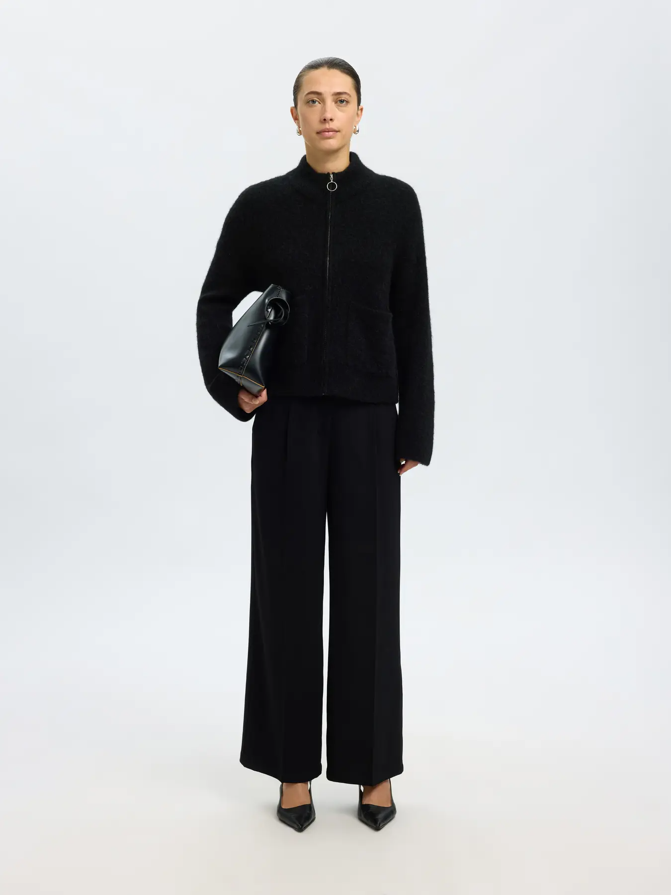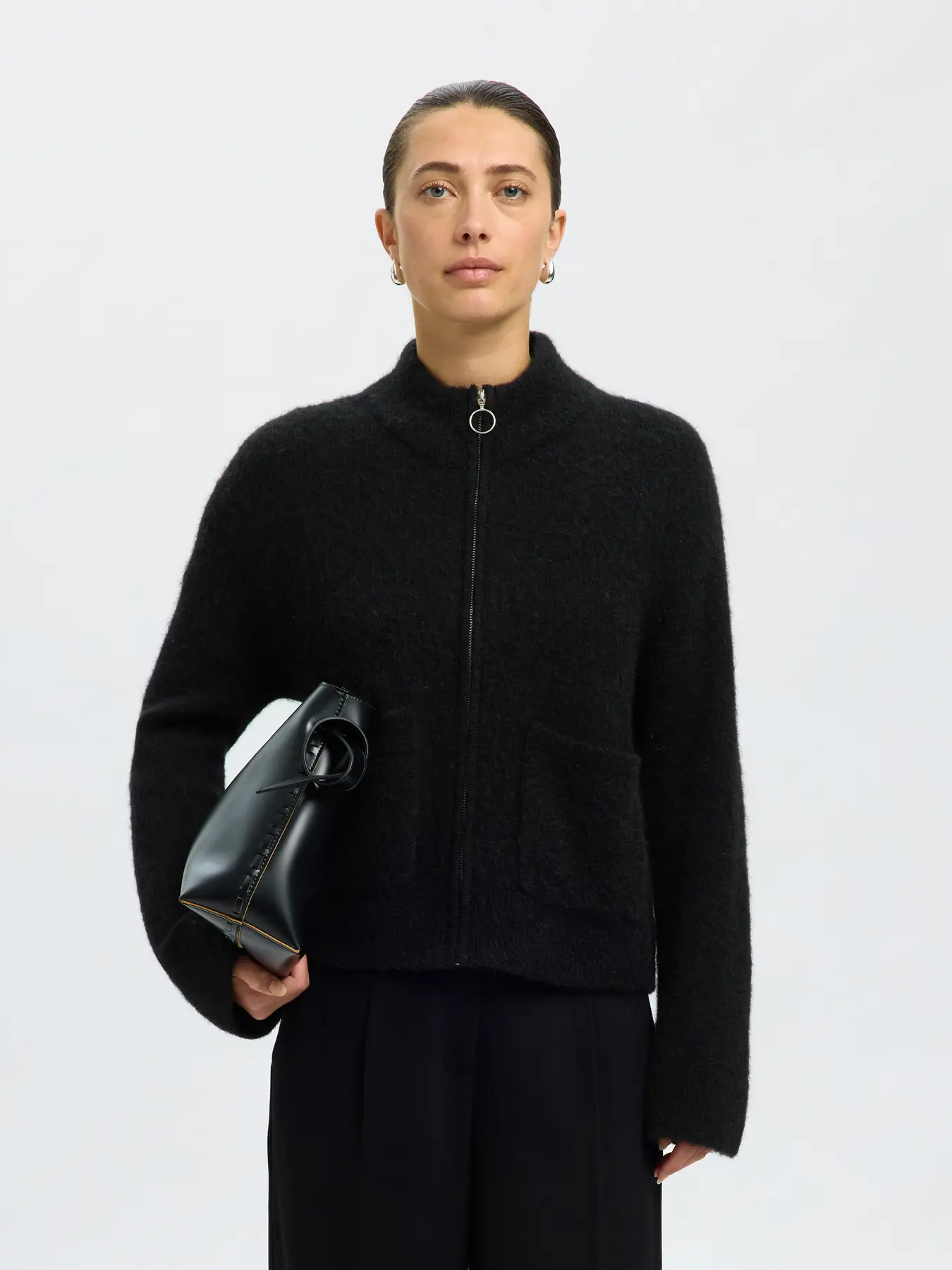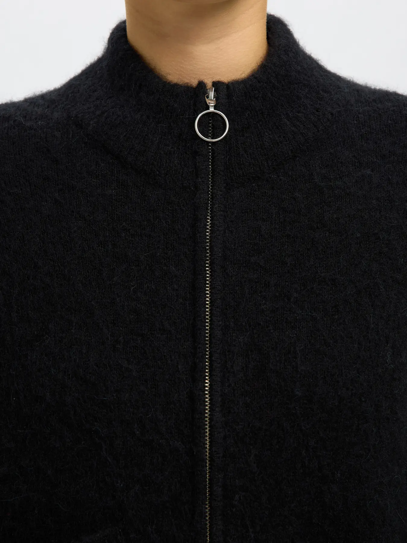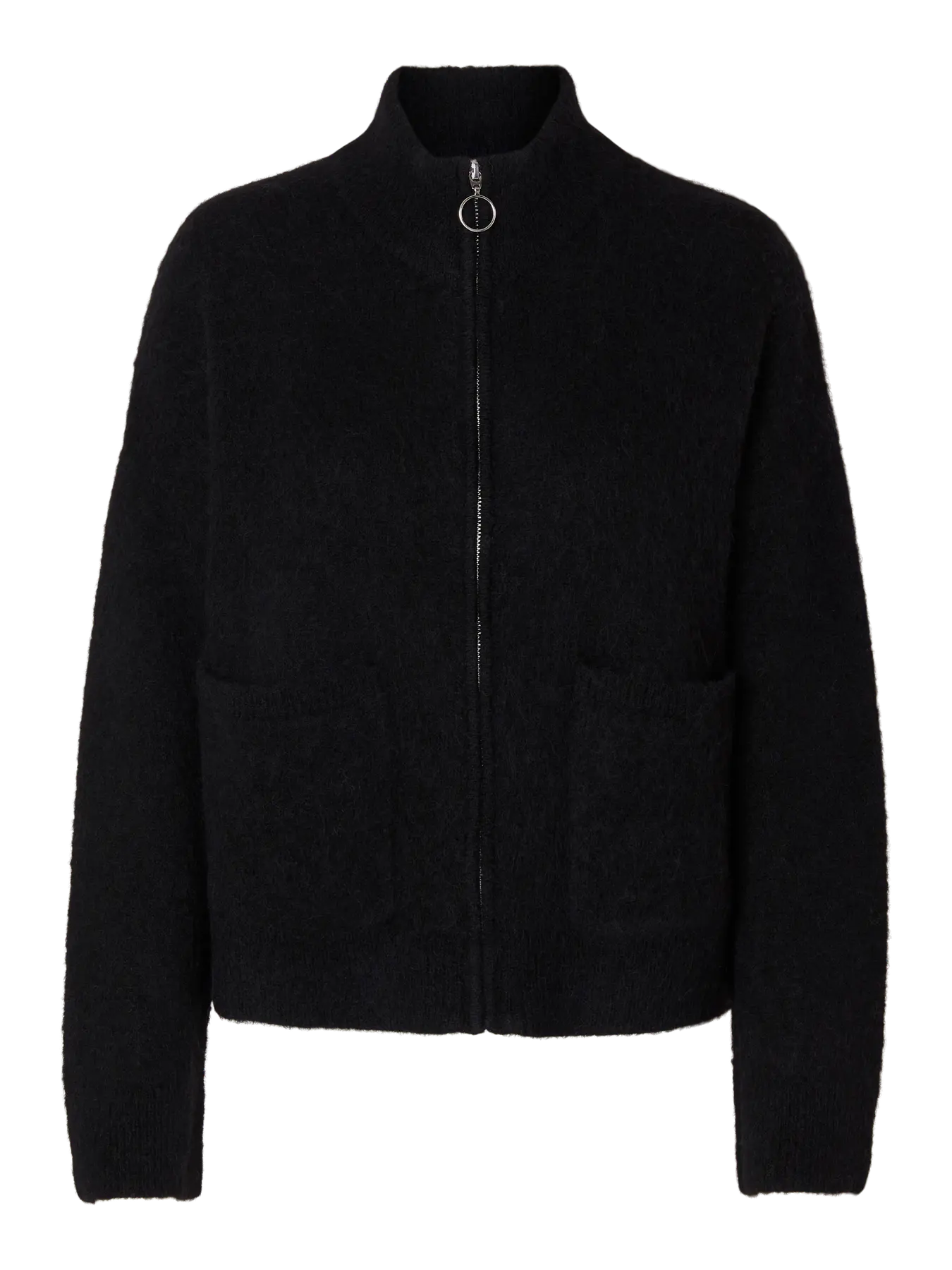 Denne myke og varme cardiganen har høy hals, lange ermer med droppede skuldre og ribbestrikkede mansjetter for ekstra komfort. Den har glidelåslukking foran, praktiske frontlommer og en løs passform som gir et avslappet, men stilfullt uttrykk.