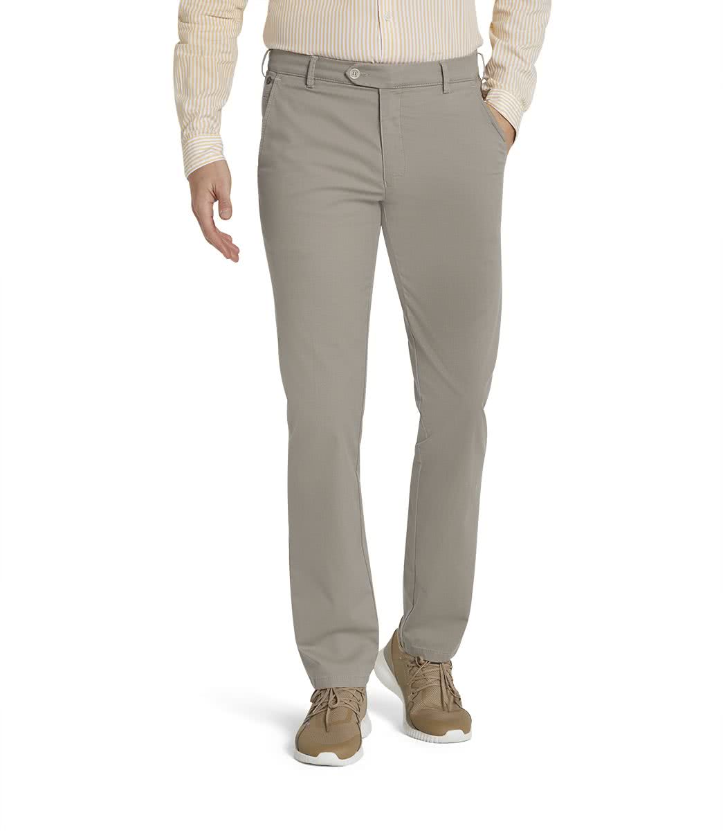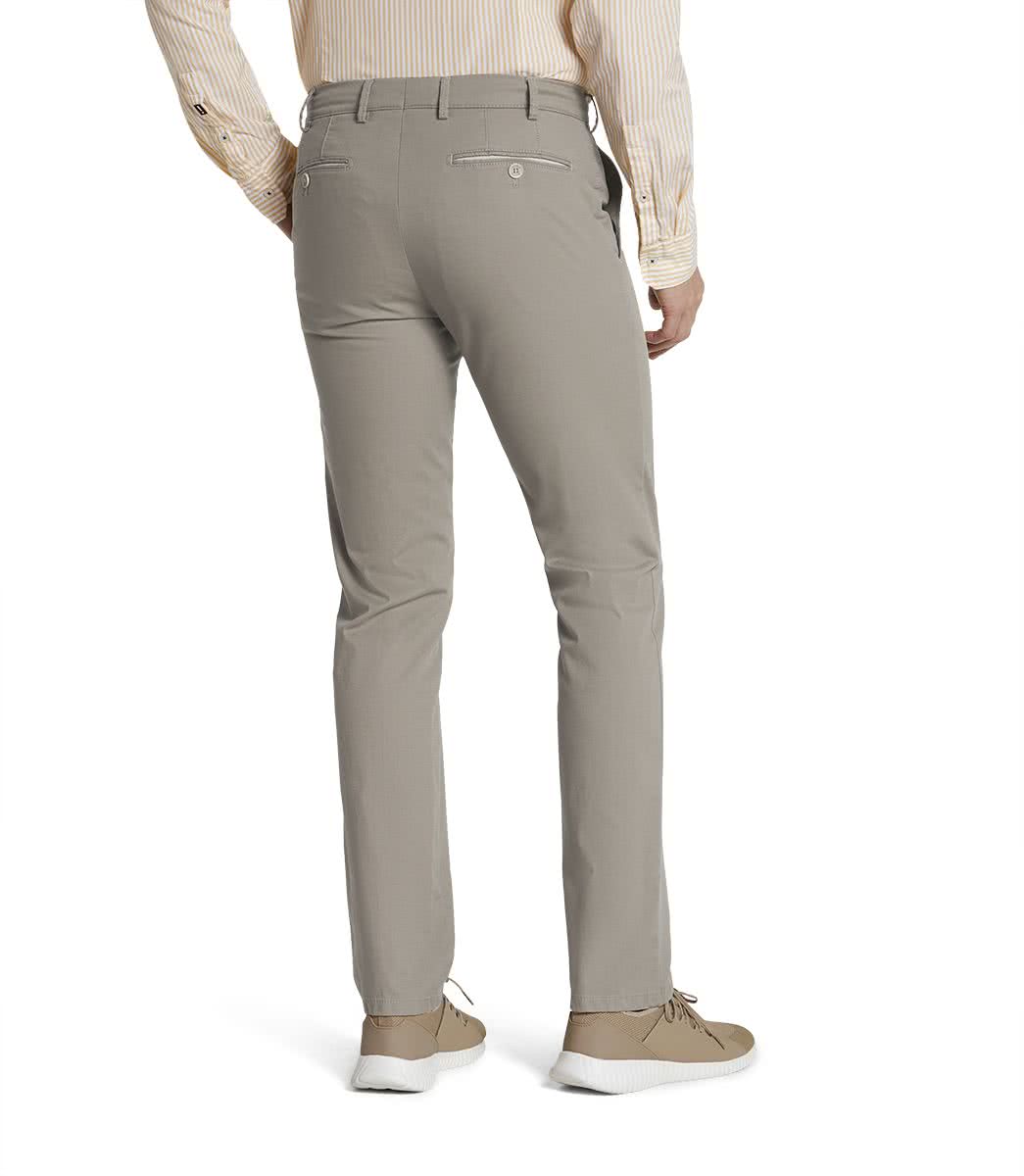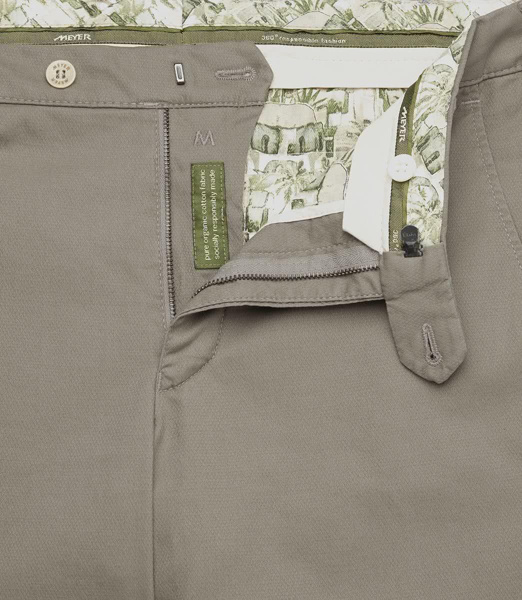 These sporty, sand-coloured chinos made from summery structured, organic cotton, stretch fabric impress with their slim fit and modern masculine look. The summery look of these trousers is supplemented by a modern mix of materials in light beige. You can tell by the typical details, such as the colourful woven inner lining and the hidden security pocket, that these chinos are from MEYER