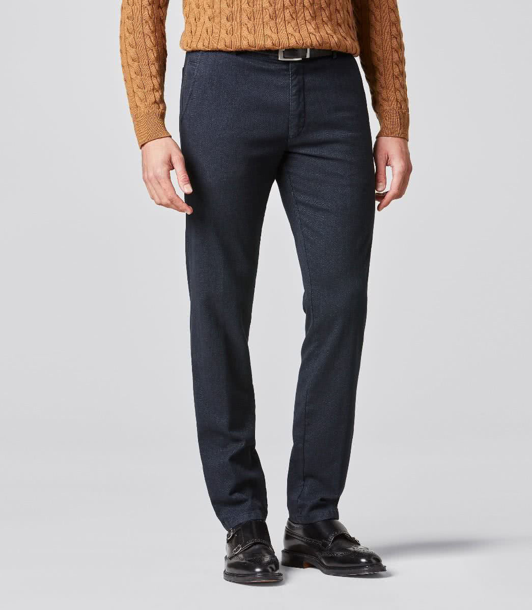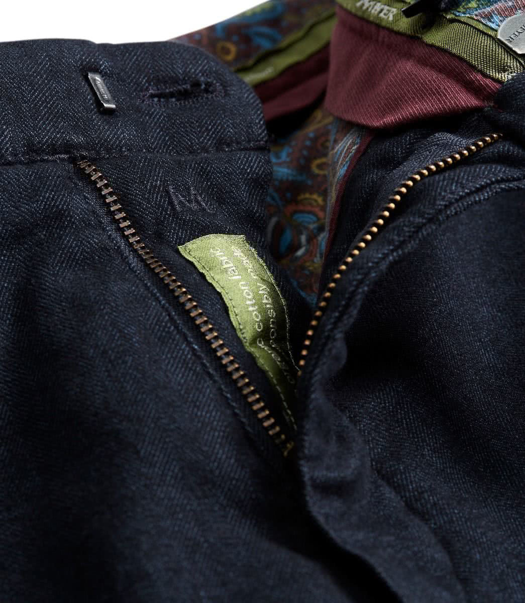 Disse buksene kombinerer komforten med chinos i bomull med det elegante ullbuksen. Det ytre materialet består av ren økologisk bomull, som er spesielt langvarig og utmerket til å holde formen takket være de superstrekkende egenskapene. Det rustikke ullutseendet i fiskebensmønster er kombinert med en moderne, slank silhuett. Den fargerike vevde fôren av høy kvalitet og den skjulte sikkerhetslommen med glidelås gjør disse chinosene til en ideell følgesvenn om høsten og vinteren.