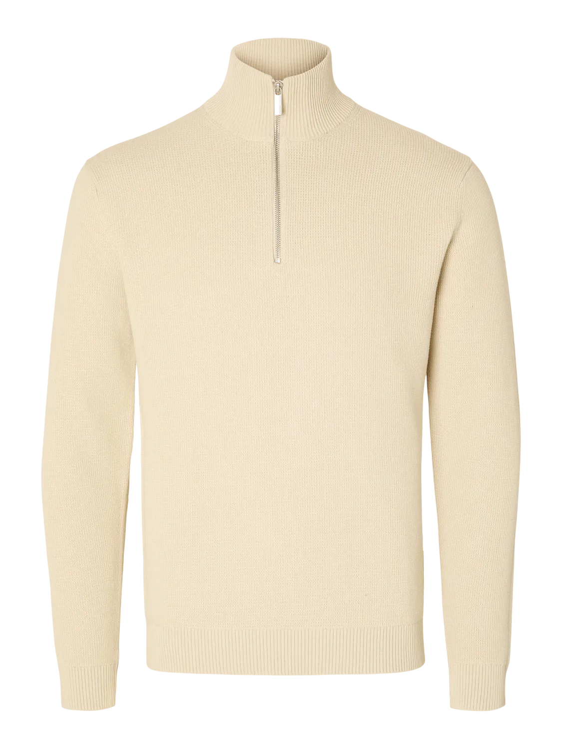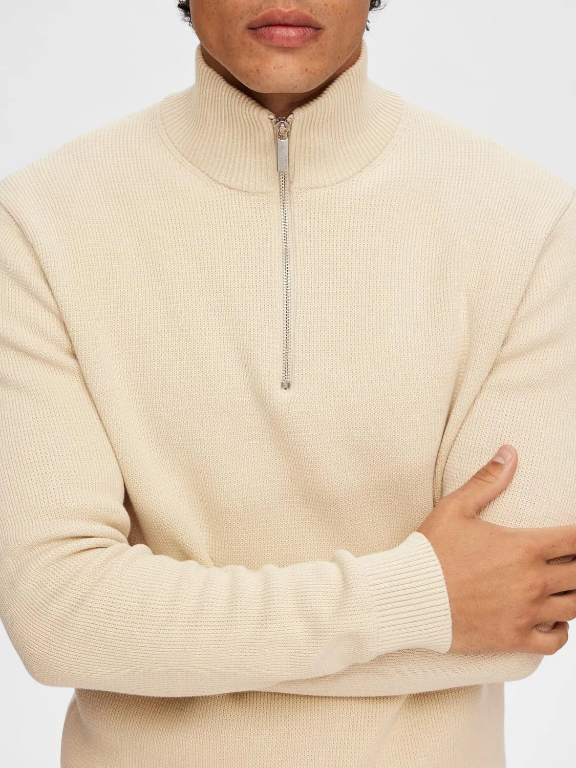 - Product Type : Knitted pullover - Neck : High Neck - Sleeve : Long Sleeves (L/S) - Cuffs : Ribbed cuffs - Closing : Half zip fastening - Fit : Regular Fit