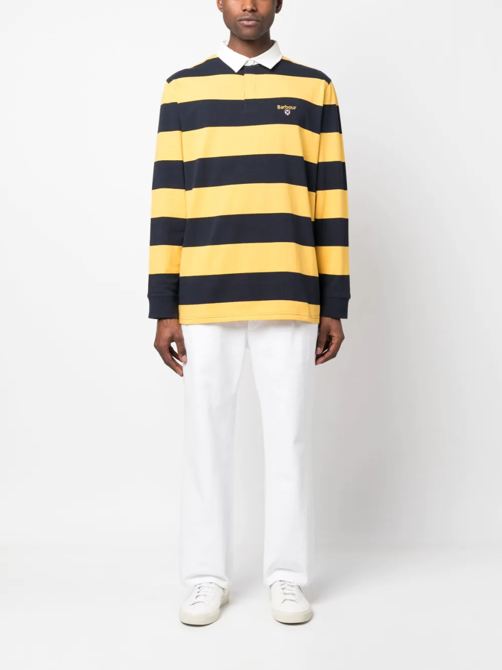 embroidered-logo long-sleeve polo shirt from BARBOUR featuring navy blue, lemon yellow, cotton, horizontal stripe pattern, embroidered logo at the chest, polo collar, long sleeves, front button placket and straight hem.