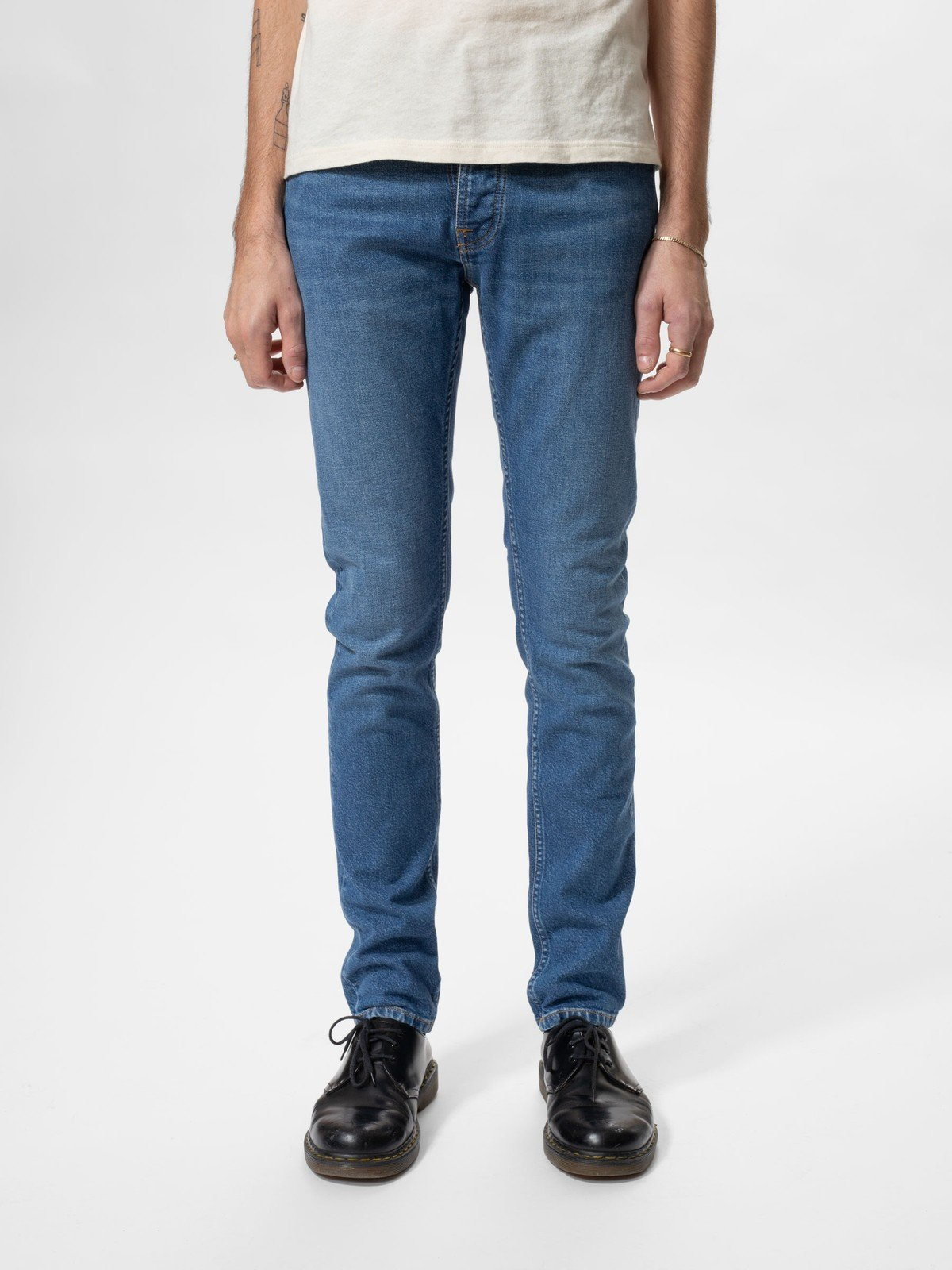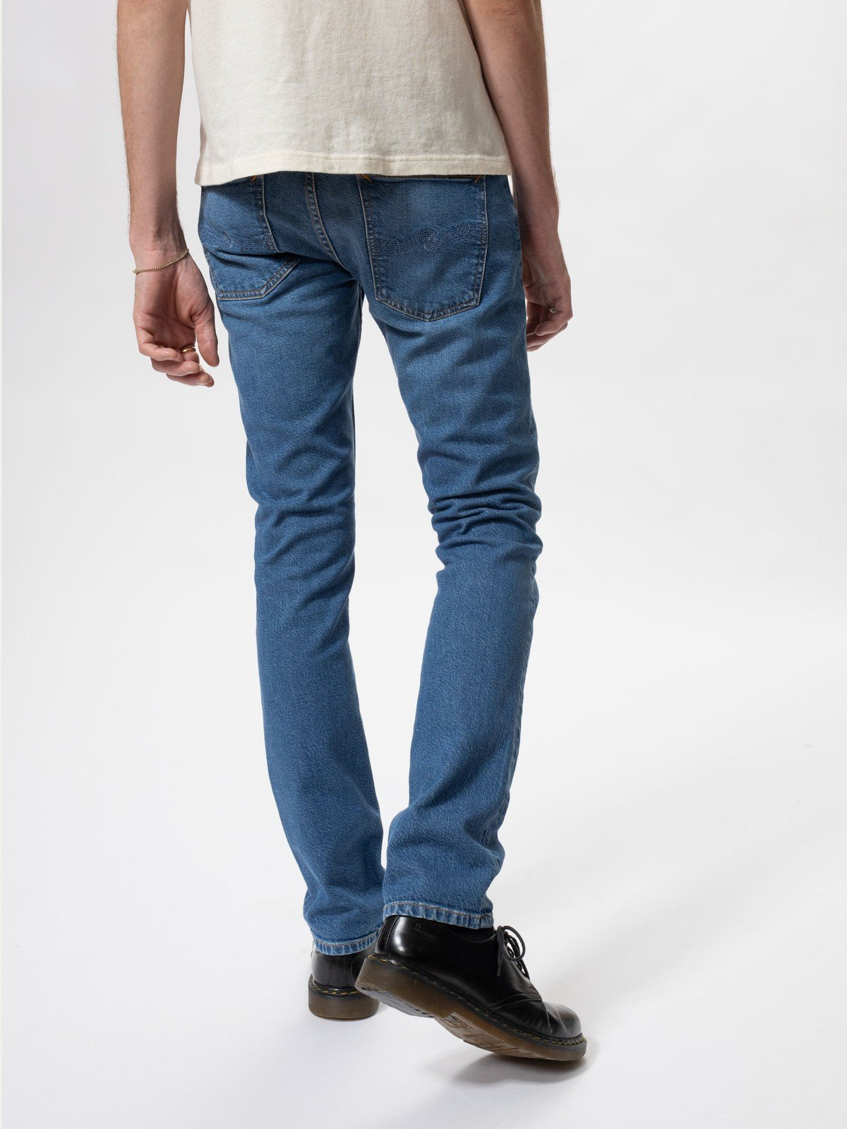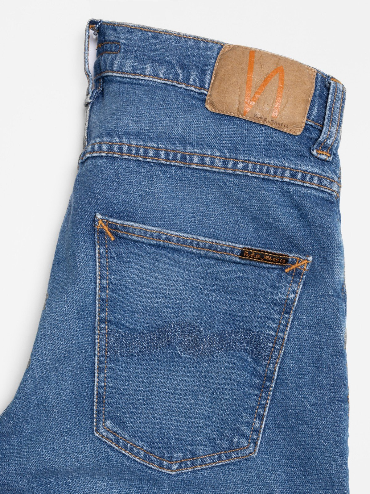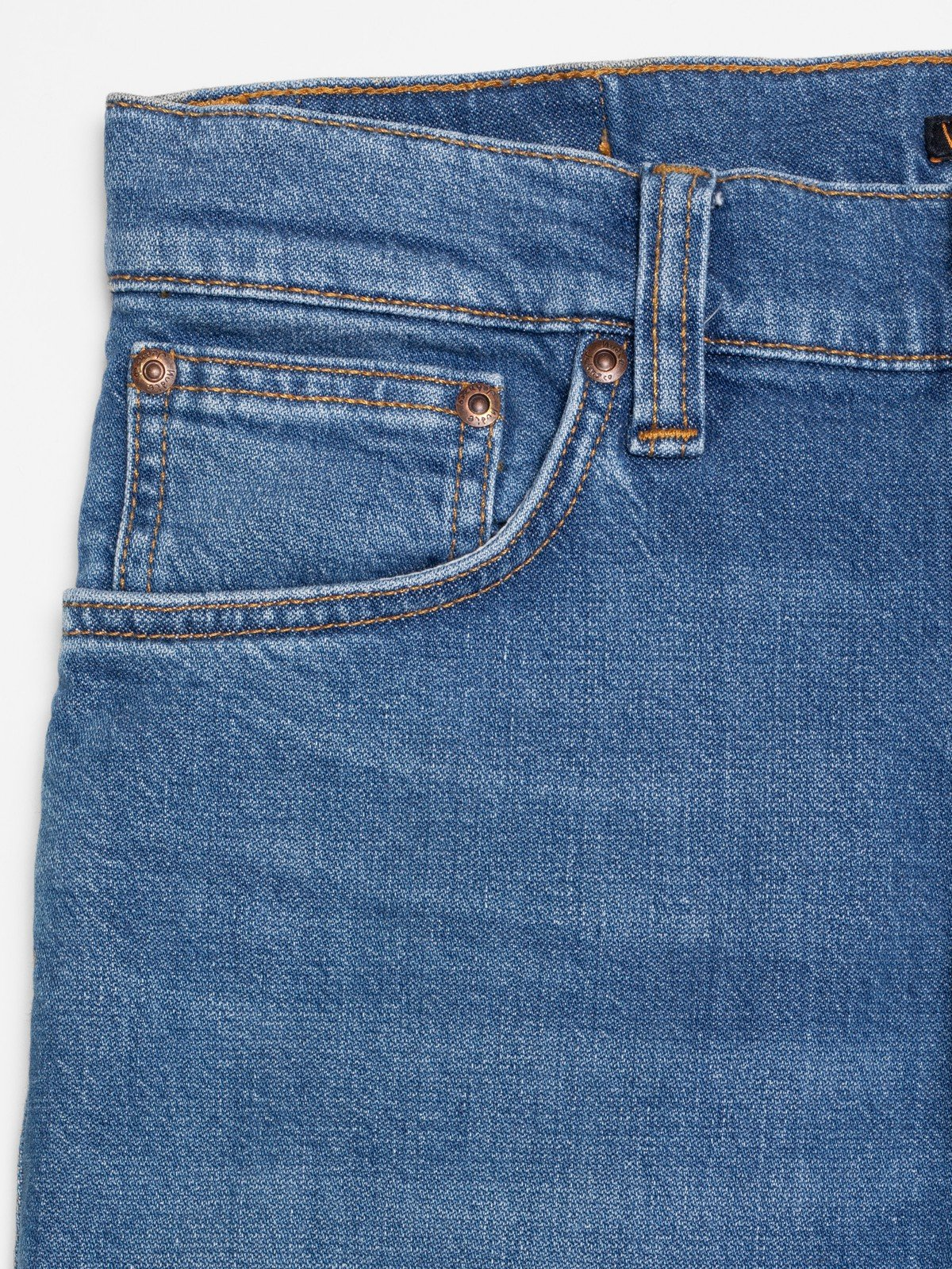 Slim-fit jeans with a straight leg, in a lovely mid-blue washed broken twill denim. Softly washed to vibrant shades of indigo with authentic wearmarks, these jeans have achieved an vintage appearance with intricate detailing and great comfort. This broken twill denim was meticulously developed to achieve a dense and substantial weight with apparent softness—a unique combination uncommon in regular denim but perfectly suited for broken twill. Drawing inspiration from a wide range of vintage broken twill denim pieces, we carefully crafted this fabric to create our best-ever broken twill denim. The tactility is sturdy yet soft, boasting a rich vintage-like hand. The texture is flat and uniform, with subtly irregular yarn slub adding an important textural contrast. The indigo and sulfur-dyed mid-blue warp yarns allow the denim to age gracefully into magical aquatic-like blue hues. Interested in learning more about broken twill denim? Broken twill is a modification of the traditional twill weave. By altering the diagonal direction of the twill, broken twill creates a distinct zig-zag pattern. While aesthetically pleasing, this alteration also has a practical advantage—it reduces the fabric's inherent tension, resulting in a softer fabric compared to its right-hand twill counterpart