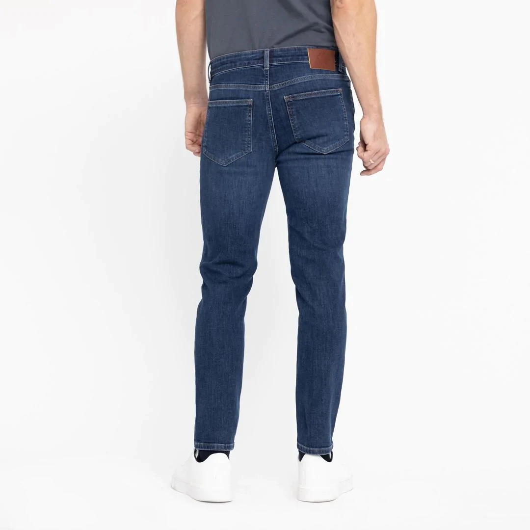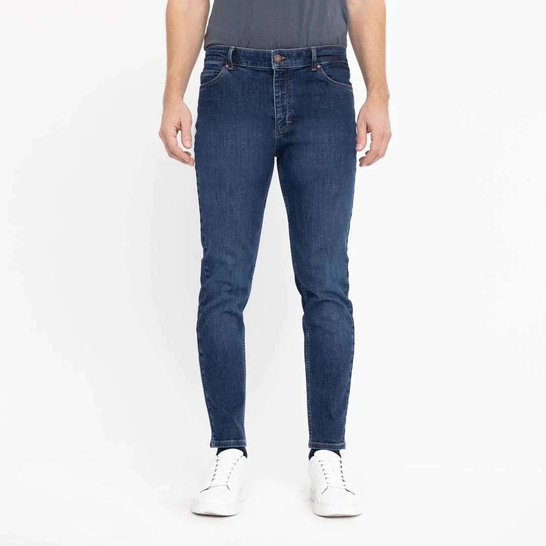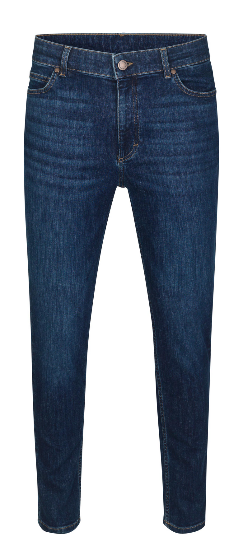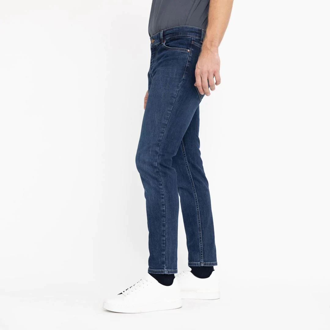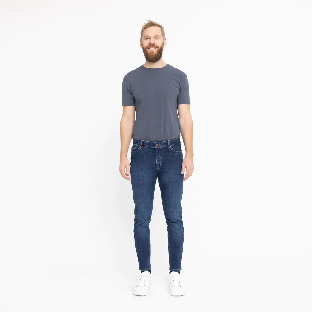 You're looking at a pair of slim-fit, dark blue, comfort-enhanced, essential jeans with a five-pocket design and a just-right vintage finish. We craft our Jacob 241 Dark Blue Vintage from a mid-weight, durable and responsive fabric of 78% cotton, 20% recycled cotton and 2% elastane. And as an unwavering standard, we construct all our Jacob jeans in a classic slim fit that lets you ride your bike, run, walk, stand, sit or squat down, and have perfect trust that these jeans hold their form and follow your every move.