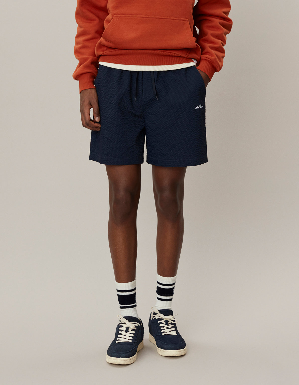 Stan Swim Shorts er laget i et teksturert seersucker-materiale som tørker raskere på grunn av forbedret luftstrøm. De har et enkelt badetøy design og er laget for komfort og funksjon. De er minimalt dekorert med kursiv bokstavlogo på låret.