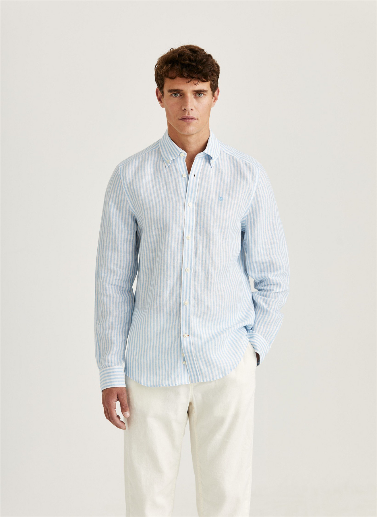 Skjorte til herre fra Morris Stockholm. Skjorten er laget av en luftig linkvalitet som er det perfekte valget på varmere dager. Den kommer med en normal passform, button-down krage og er ferdig med en brodert logo på venstre bryst.