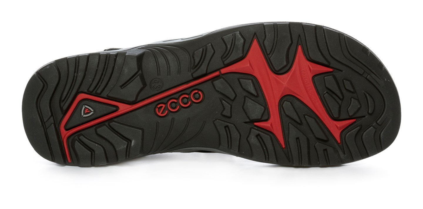 Sporty ECCO sandal i myk nubuck. Pen, svart modell med justerbare remmer og knepping med borrelås. Fantastisk bekvem og opphøyd såle som følger fotens naturlige bevegelse i steget. Perfekt for spaserturer og aktive dager
