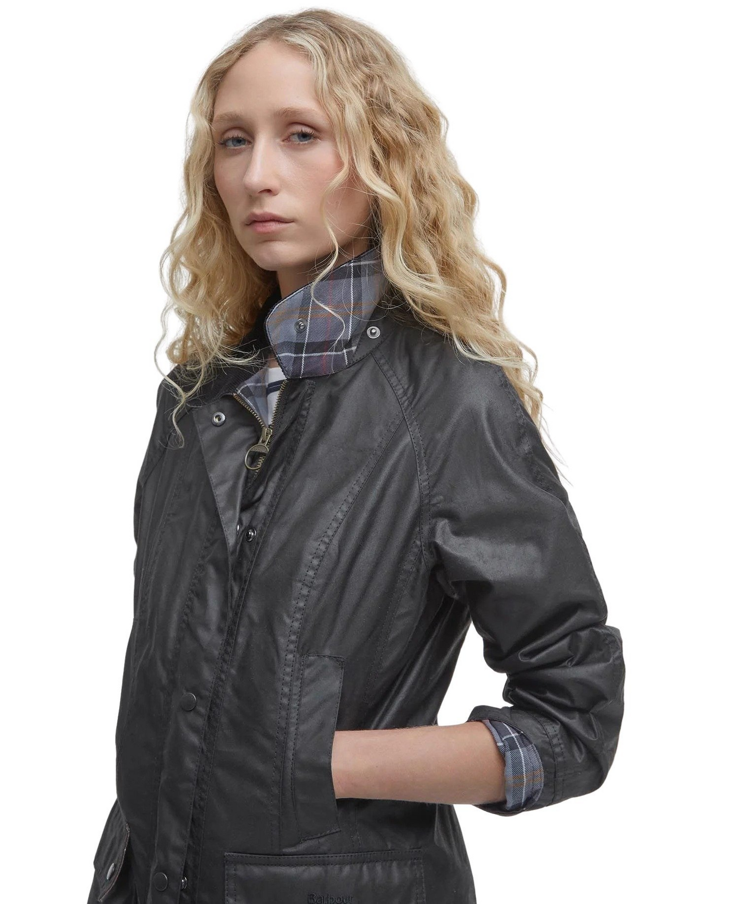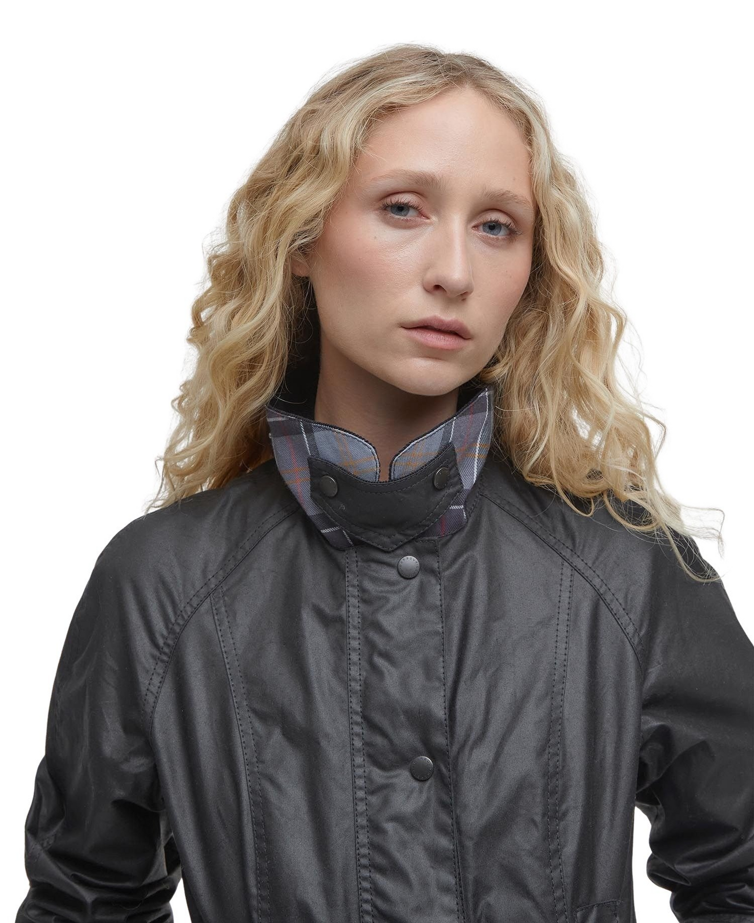Voksjakke til dame fra Barbour. Jakken er laget i Sykoil vokset bomull og et bomullsfôr på kroppen med Barbours signatur tartan. Jakken er ideel for helårsbruk og kan legges i lag eller bæres alene avhengig av sesong. Den er pyntet med logoemblem på venstre lomme.