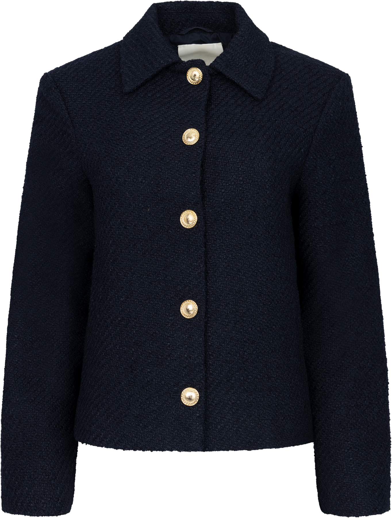 Abriella Jacket fra Moss Copenhagen. Abriella Jacket er en tidløs og klassisk jakke som passer til enhver anledning. Jakken har kort og rett passform med krage, dekorative knapper i front, skulderputer og lange, vide ermer. Den har lommer i front og er laget i eksklusiv boucle for en chic look. Styles til jeans og sneakers til hverdags eller dressbukse og støvletter til fest.