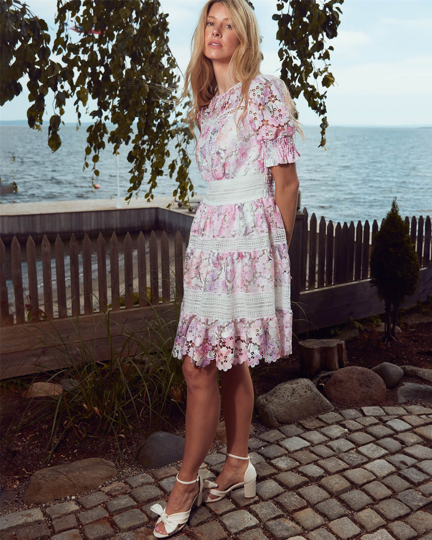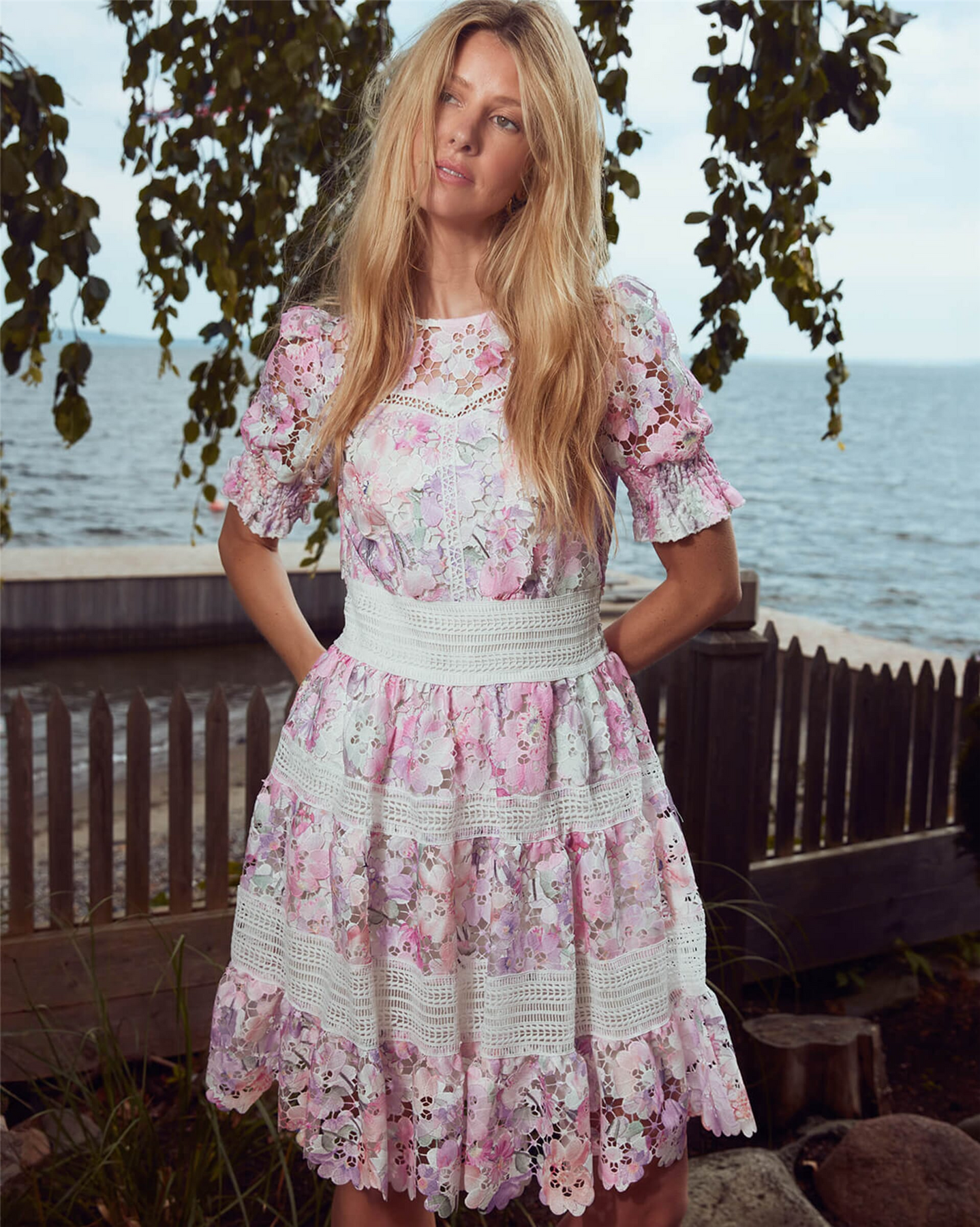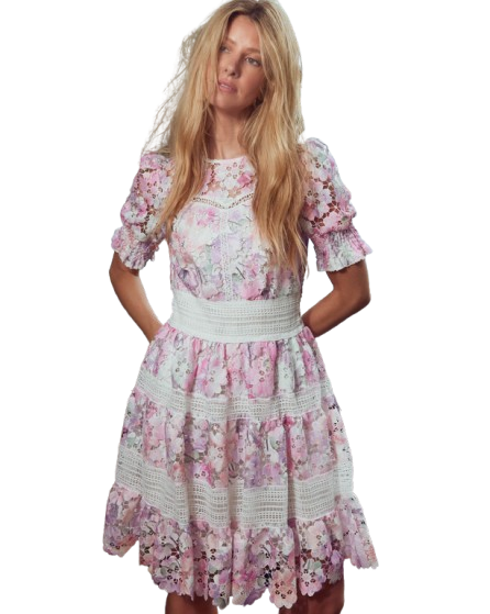 Kort kjole med heldekkende, delikate blonder og blomsterprint i pastellfarger. Kjolen har markert midje foran som gir en feminin silhuett, og bred strikk i ryggen. Rund hals og knapp i nakken. Korte ermer med bred strikk ytterst.
