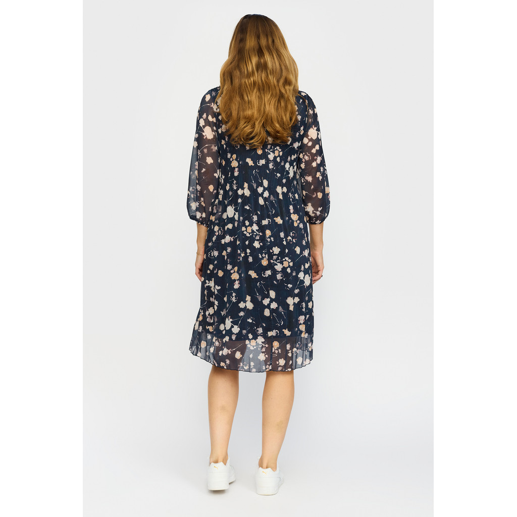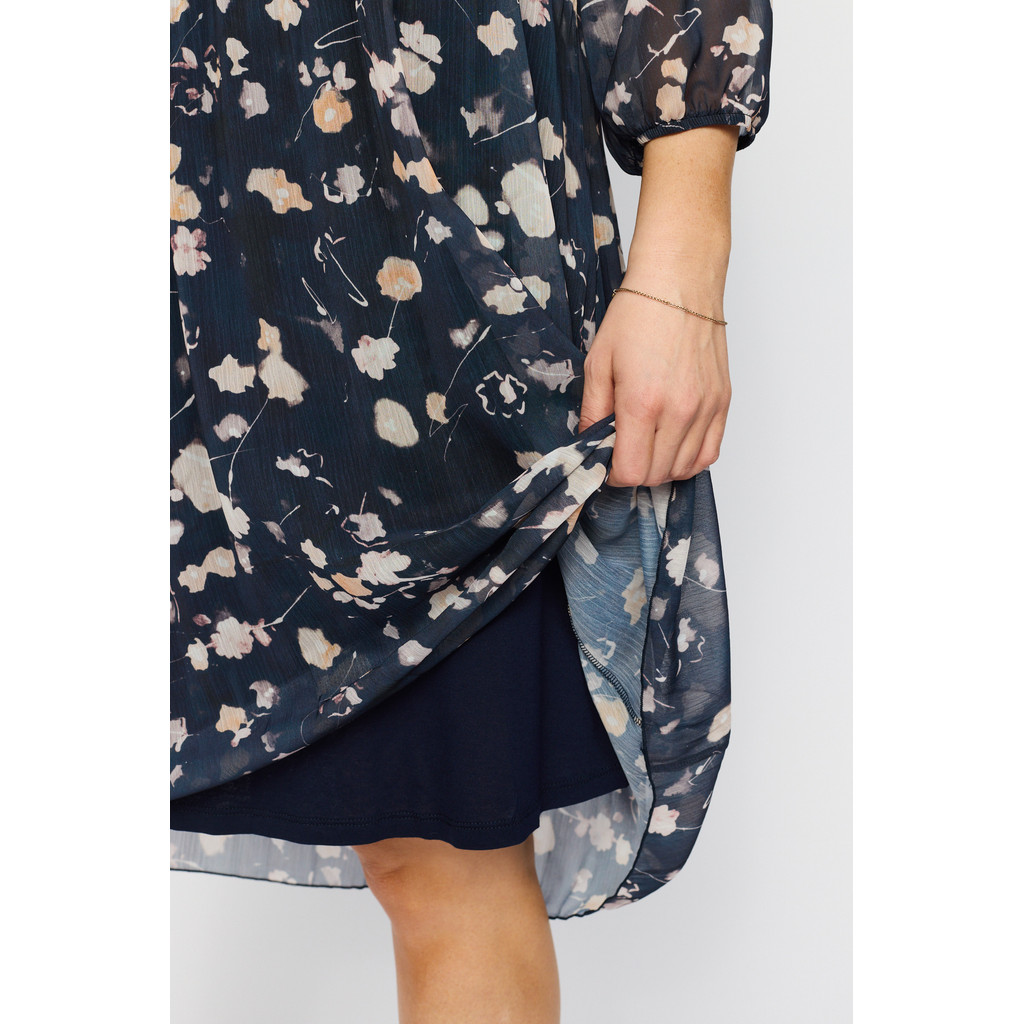 Kjolen er mørk bunn med et lekkert blomsterprint på plissert stoff. 3/4 dels ermlengde og knelang lengde på skjørtet. Kjolen er foret med et sort og strechy for.