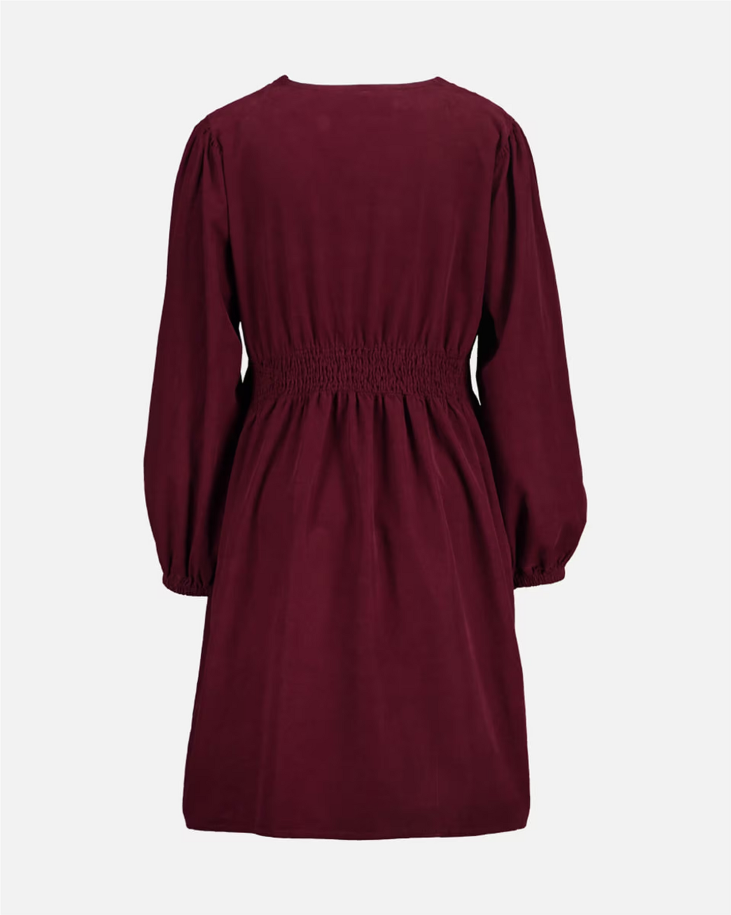 Kjole i myk kordfløyel som kombinerer komfort med et moderne uttrykk. Kjolen har V-hals med knapper nedover overdelen. Den har lange ballongermer med tynn strikk rundt håndleddet.
