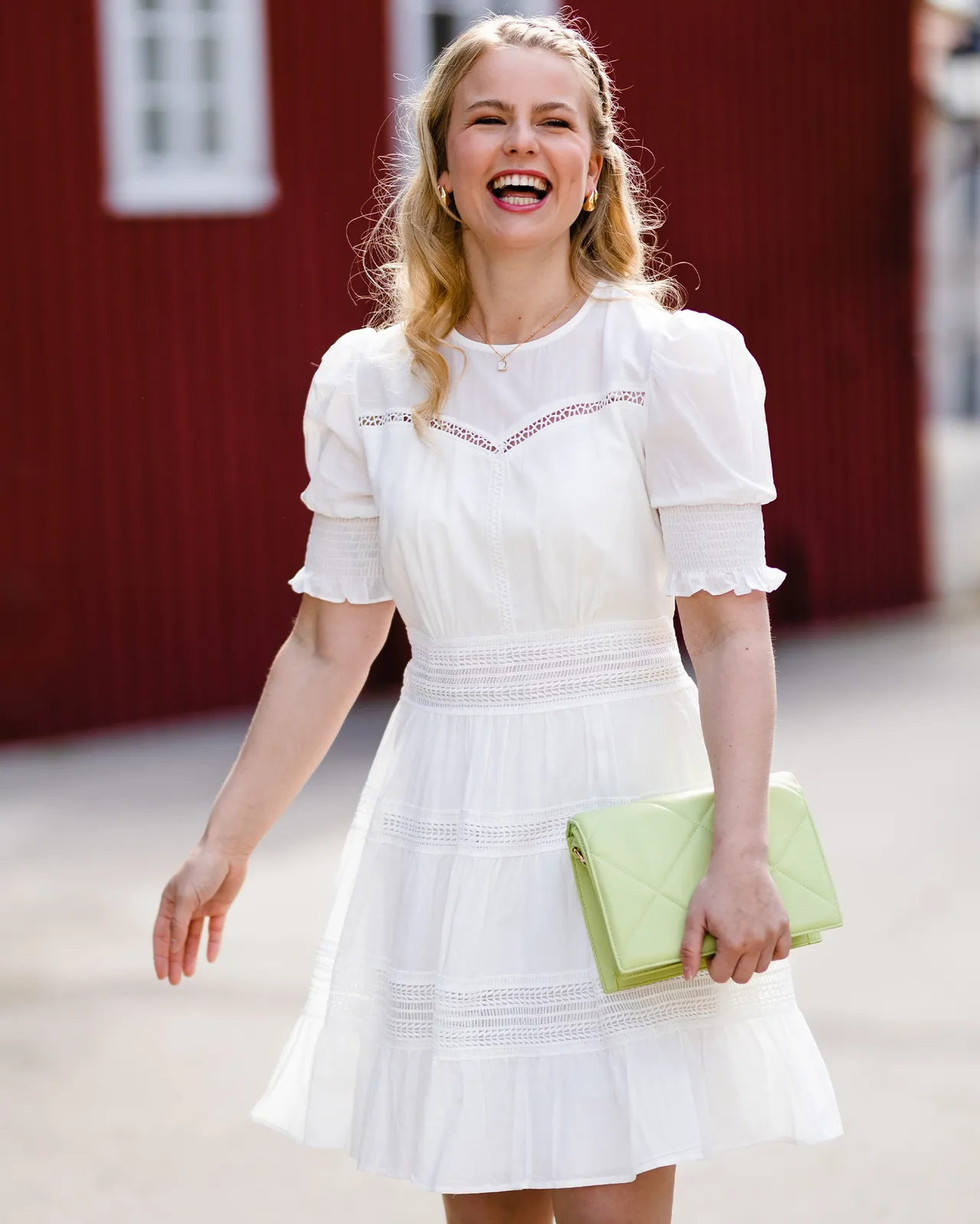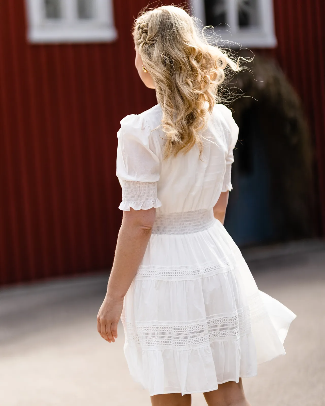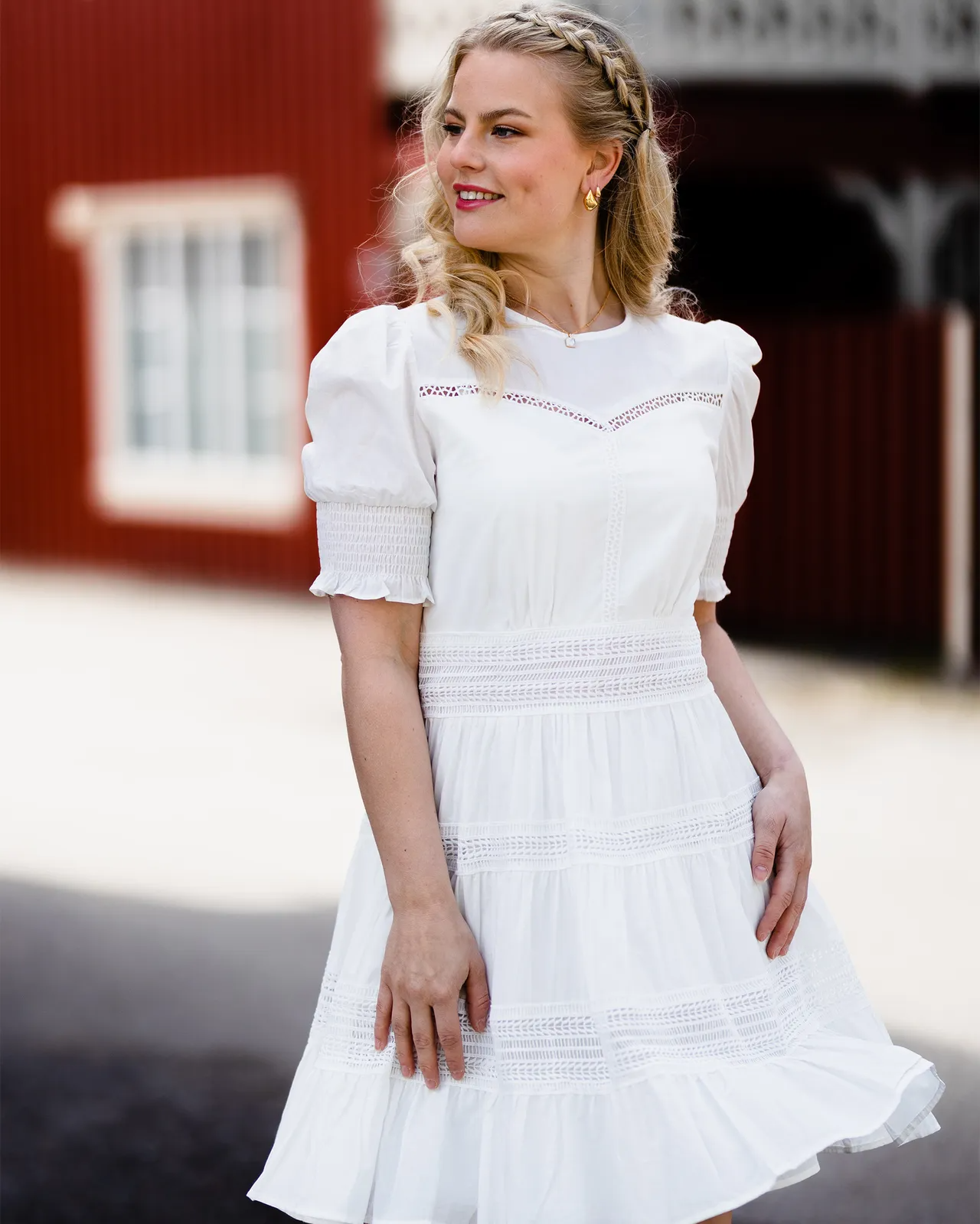 Ensfarget kjole med rund hals og knapp i nakken med nøkkelhullsåpning. Brodert kant på overdelen, som er delvis gjennomsiktig helt øverst. Korte ermer med legg på skuldrene og bred strikk med rysjekant nederst. Bred brodert kant i midjen foran. Bred strikk i midjen, kun på baksiden av kjolen. A-formet skjørt med broderte detaljer.