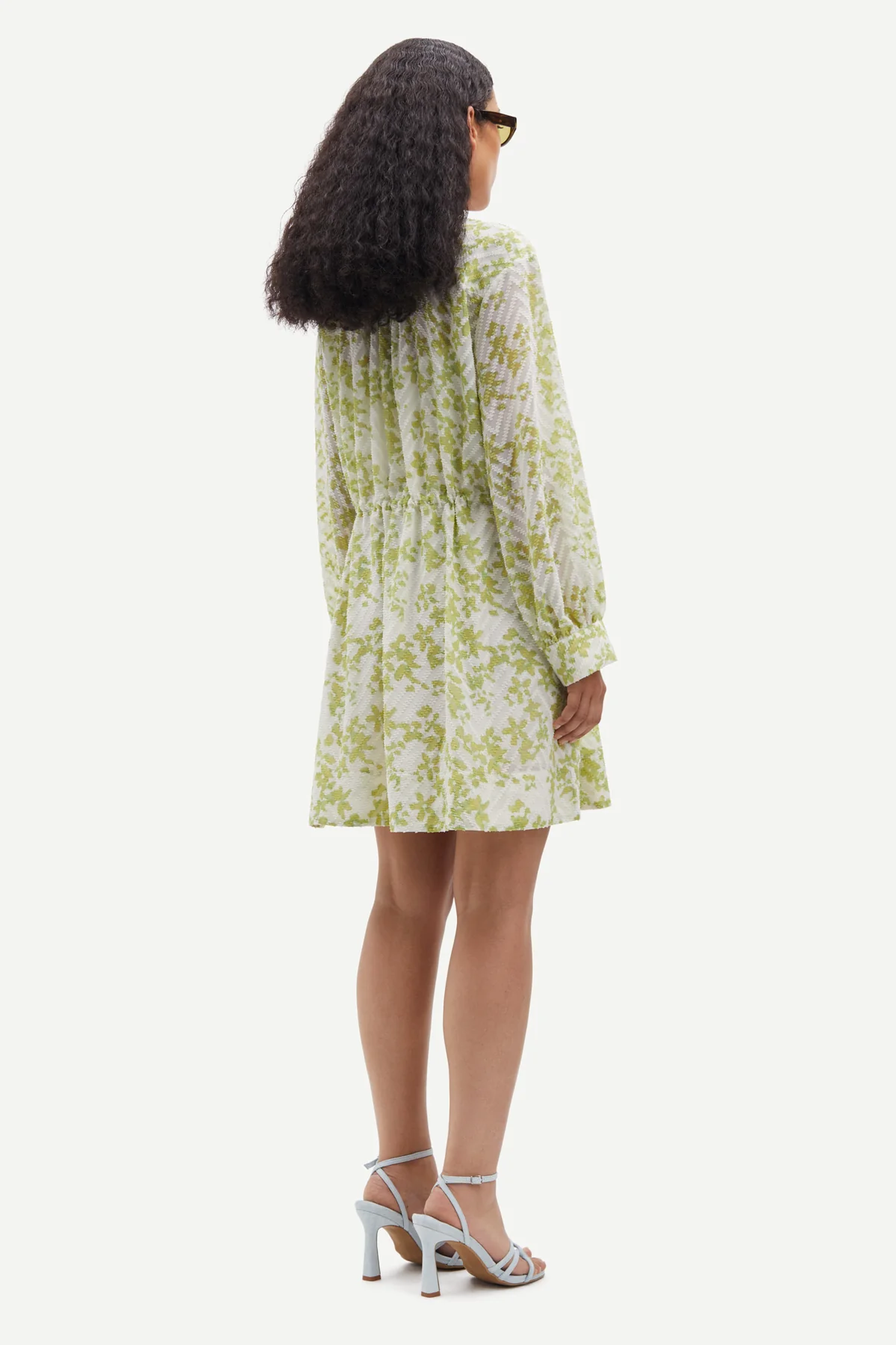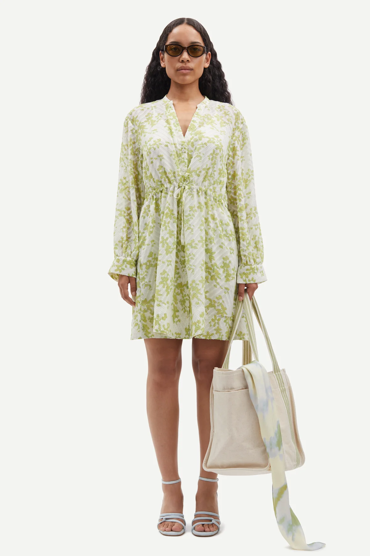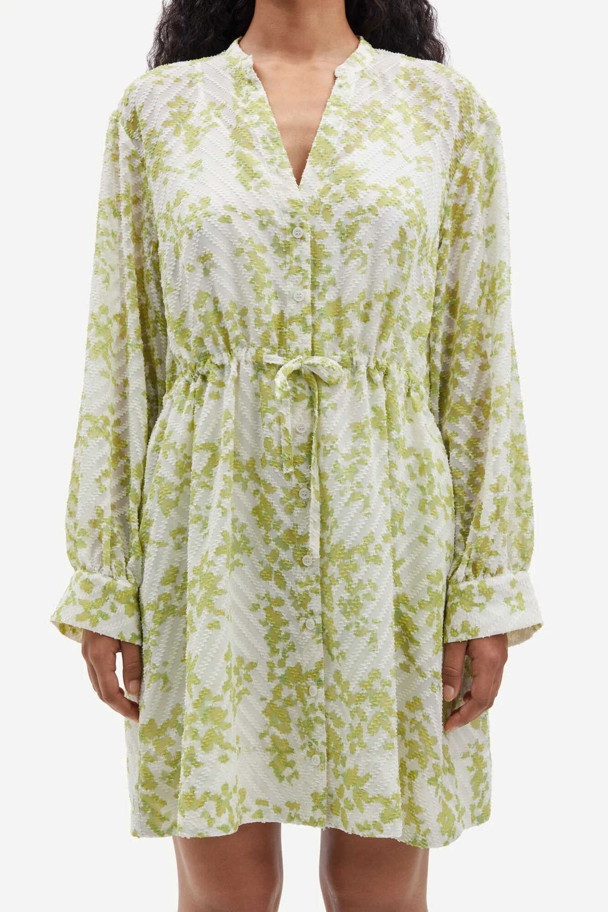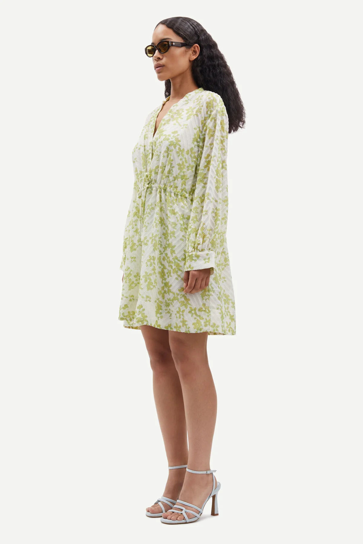 Saamelie Dress fra Samsøe Samsøe. Søt, kort sommerkjole fra Samsøe Samsøe med grønt blomsterprint. Saamelie Dress har lange, rette ermer med knapper på mansjettene. Kjolen har V-hals og løs passform med snøring i midjen som lar deg justere og variere passformen. Kommer med underkjole.