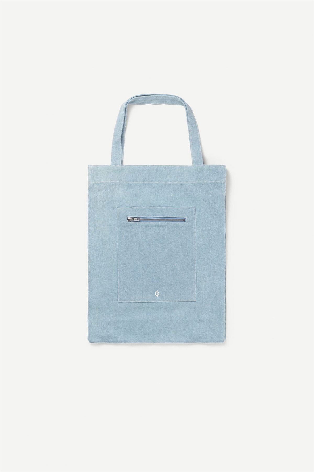 Spacious denim shopper with handles. Zipped pocket on the back. Printed Samsøe Samsøe branding on the front and printed ø branding on the back pocket. Silver-toned hardware. Main material made from a blend of cotton and recycled cotton.