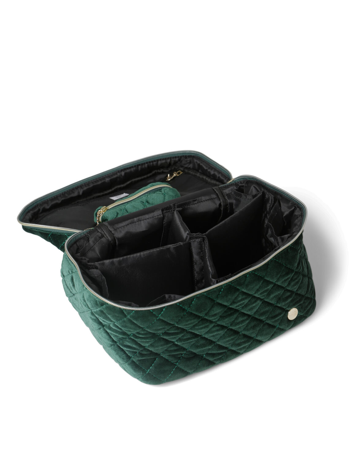 Praktisk og vakker toalettmappe. Praktisk inndeling med flere rom, og man kan fjerne romdelingen dersom man kun ønsker et stort rom. Små lommer langs kantene og en stor lomme med glidelås i lokket.