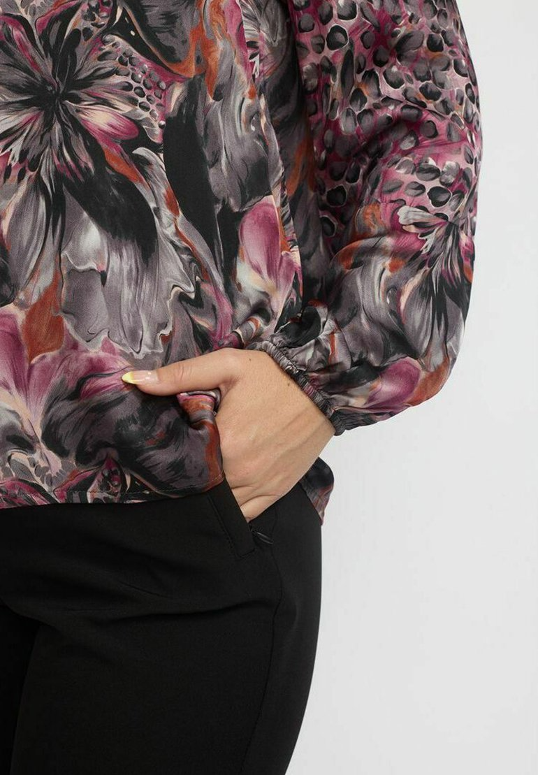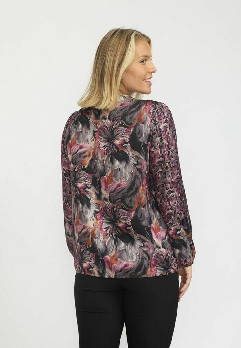 Populær og god bluse fra merke 2-Biz med en miks av print i deilig viskose- og silkeblanding. Blusen har en rund krage med en liten v-utringning og en halv knappestolpe, og lange ermer med strikk nederst.
