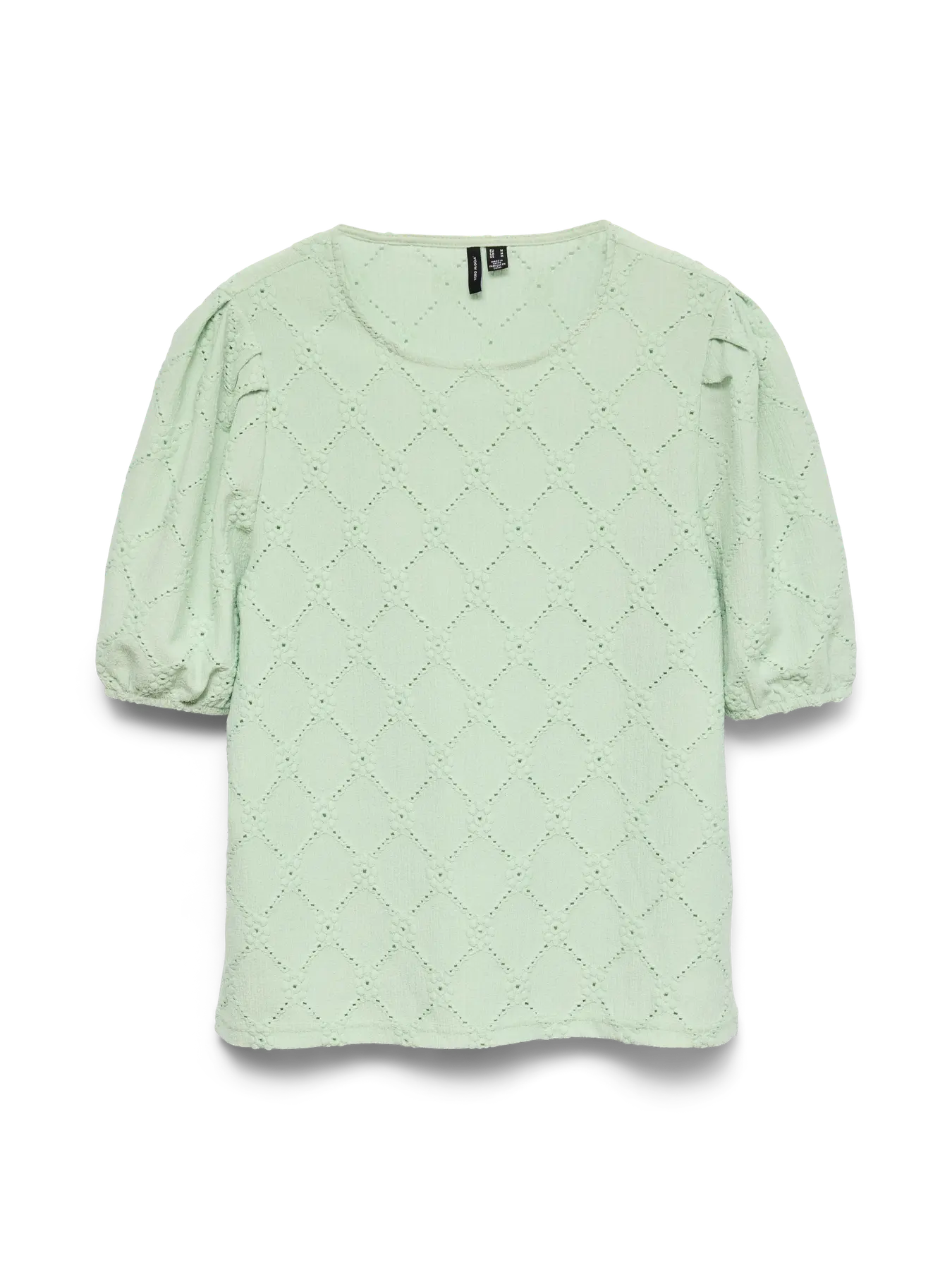 Denne rundhalsede toppen kombinerer romantisk eleganse med moderne komfort. De korte puffermene og dekorative volangene gir plagget et feminint uttrykk, mens den myke single jersey-kvaliteten gjør det behagelig å bruke – hele dagen.