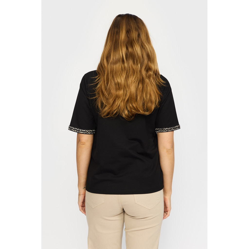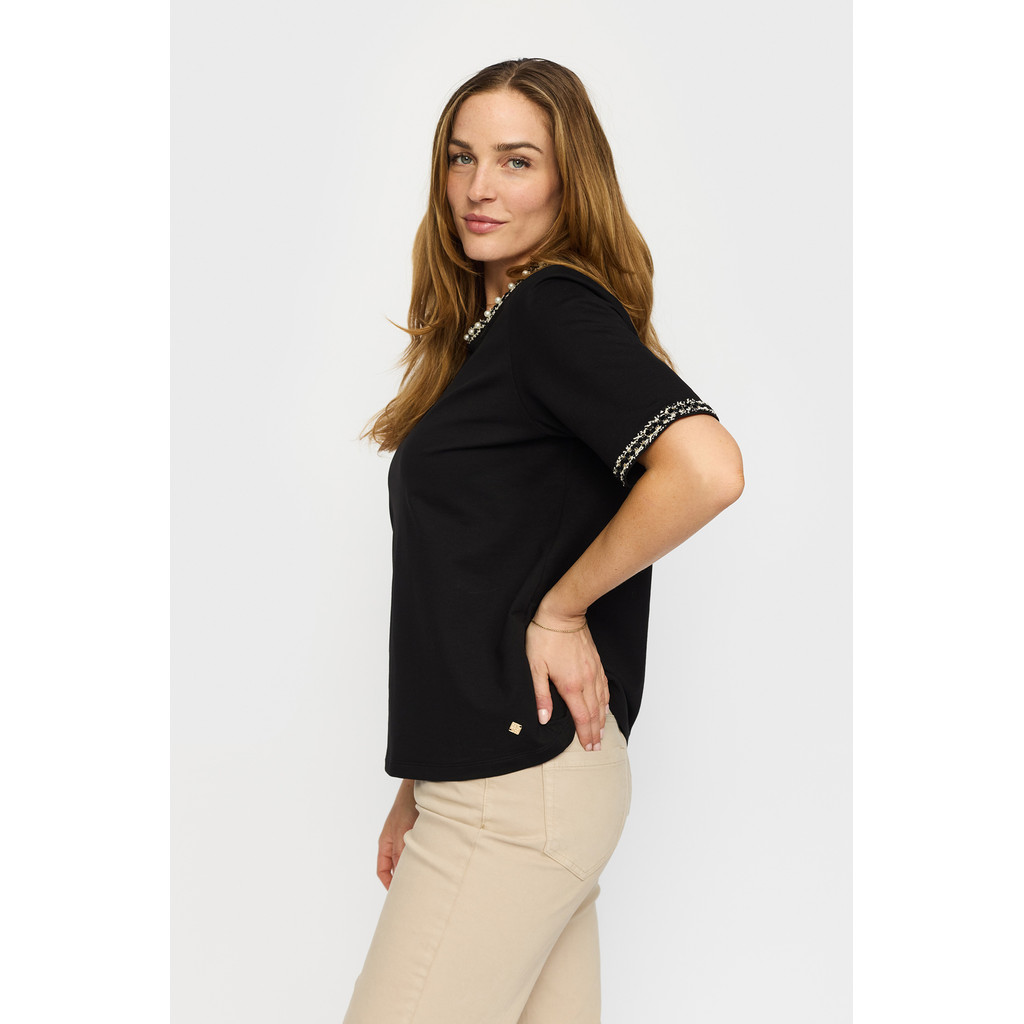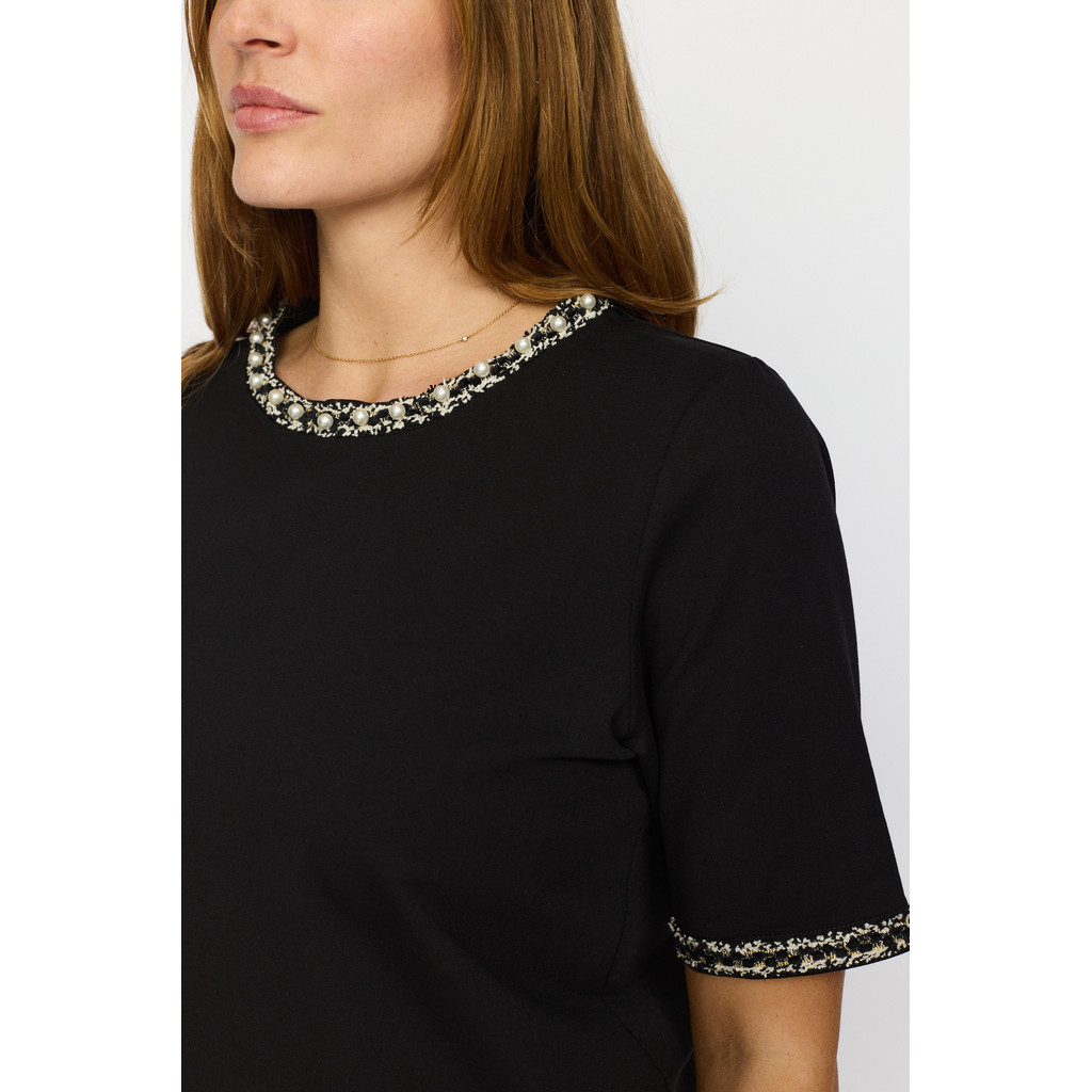 T-skjorten har lekre perler og broderi i halsen, og rundt ermene.