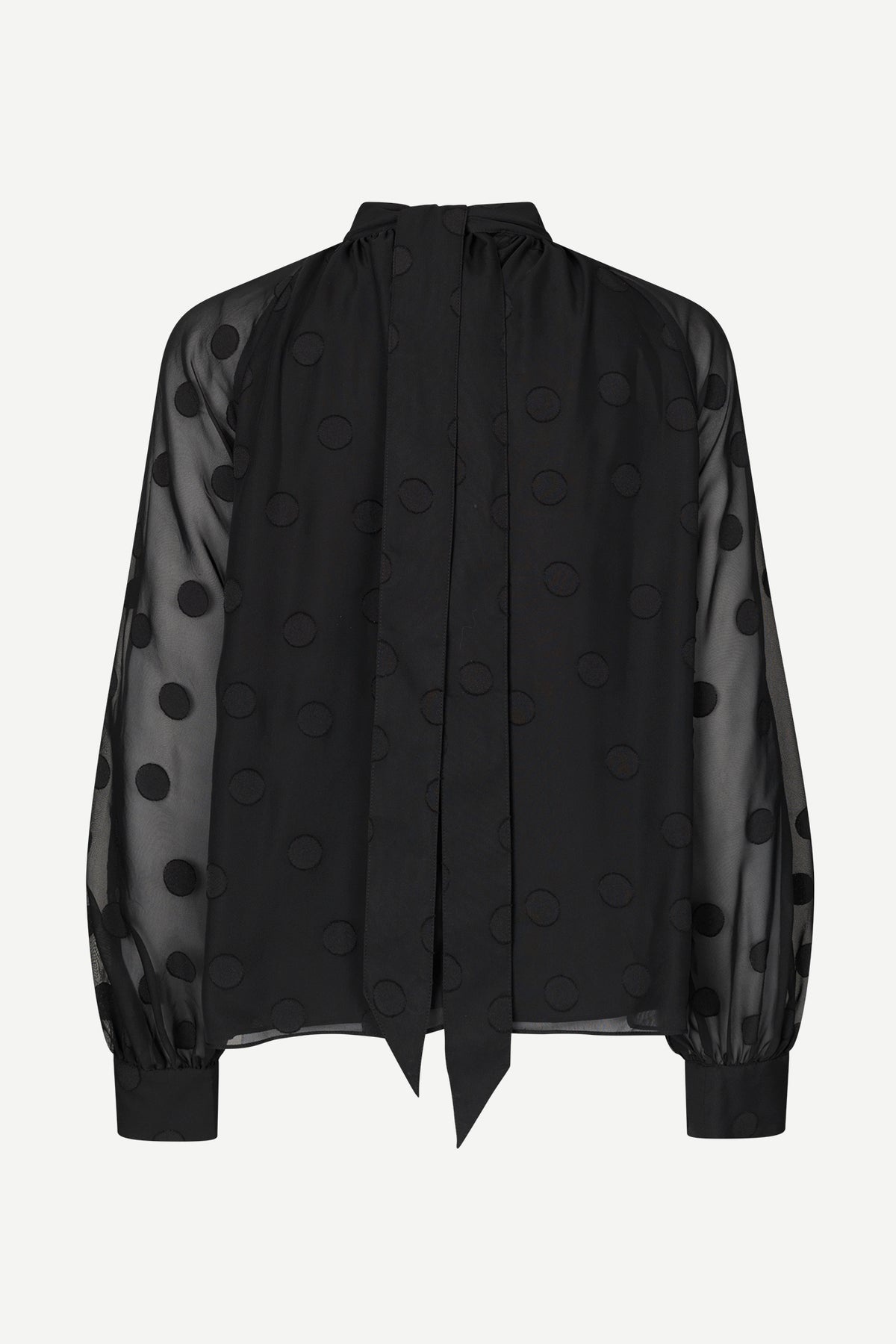 Ebbali Blouse fra Samsøe Samsøe. Avslappet langermet bluse med sløyfe i nakken fra Samsøe Samsøe. Ebbali Blouse har raglanermer med rynkede mansjetter, og den semi-gjennomsiktige blusen har et prikkete mønster. Blusens avslappede passform sørger for maksimal komfort, samtidig som den høye halsen, sløyfen i nakken og de voluminse ermene med smal mansjett gir blusen et klassisk og elegant uttrykk.