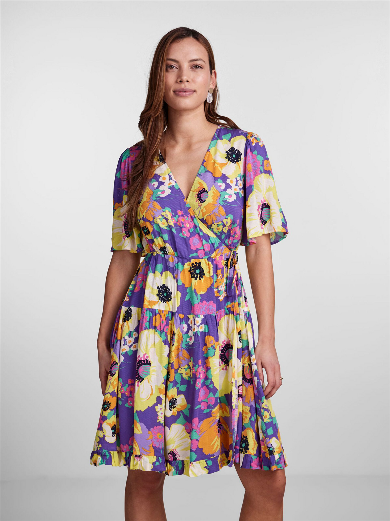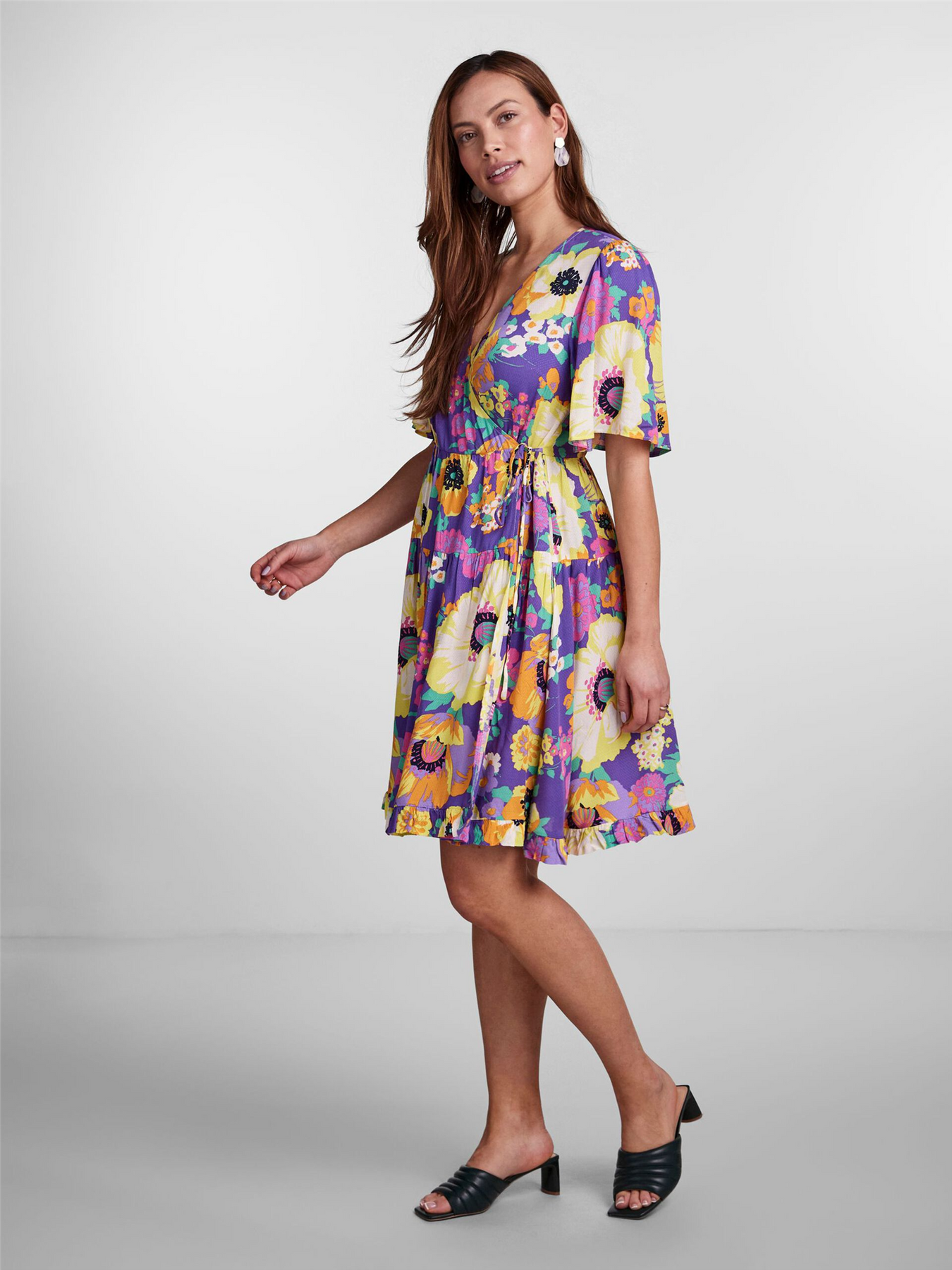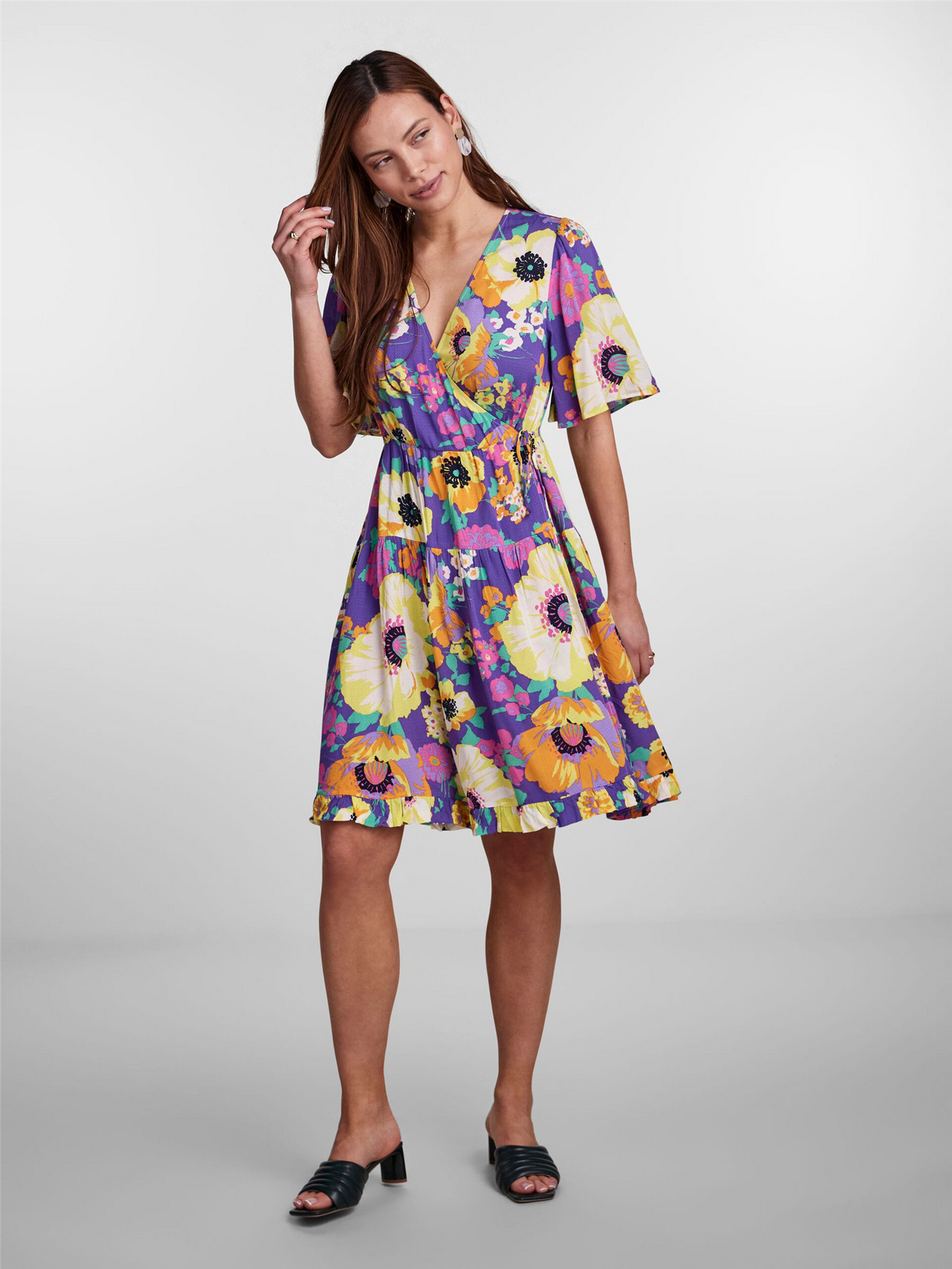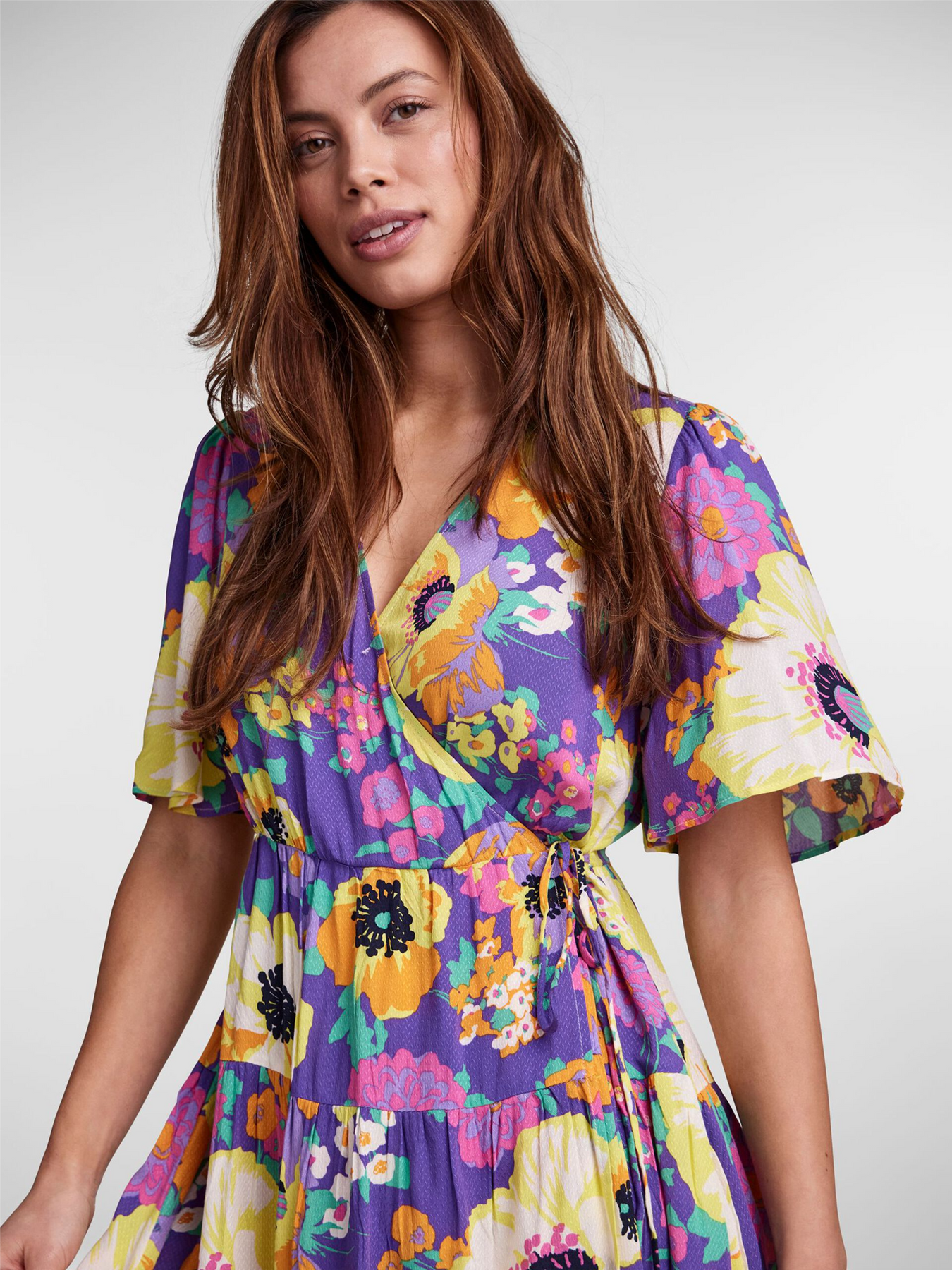 - Floral print wrap dress - V-neck - Short sleeves - Side tie fastening - Tiered skirt - Mini length - Model is wearing size M
