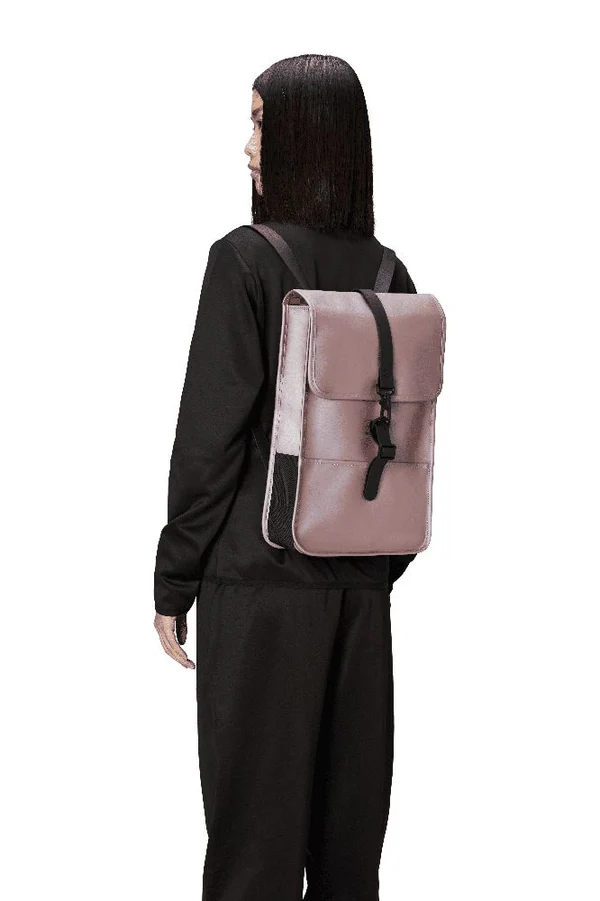 Backpack Mini is a downscaled version of Backpack, a true Rains classic. The silhouette is characterized by its prominent flap and central strap with carabiner closure. This clean and ever contemporary waterproof rucksack features an internal laptop pocket, a main compartment, and a concealed external phone pocket on the back panel.