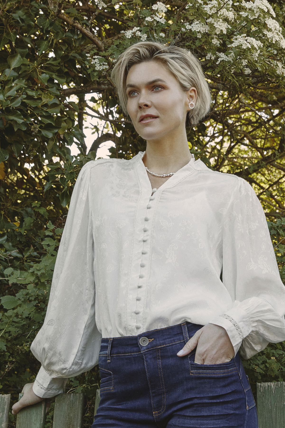 En elegant skjorte med fine detaljer som gjør den både vakker og sofistikert. Den har et delikat mønster, knapper helt ned, og en fin detalj i enden av ermet.