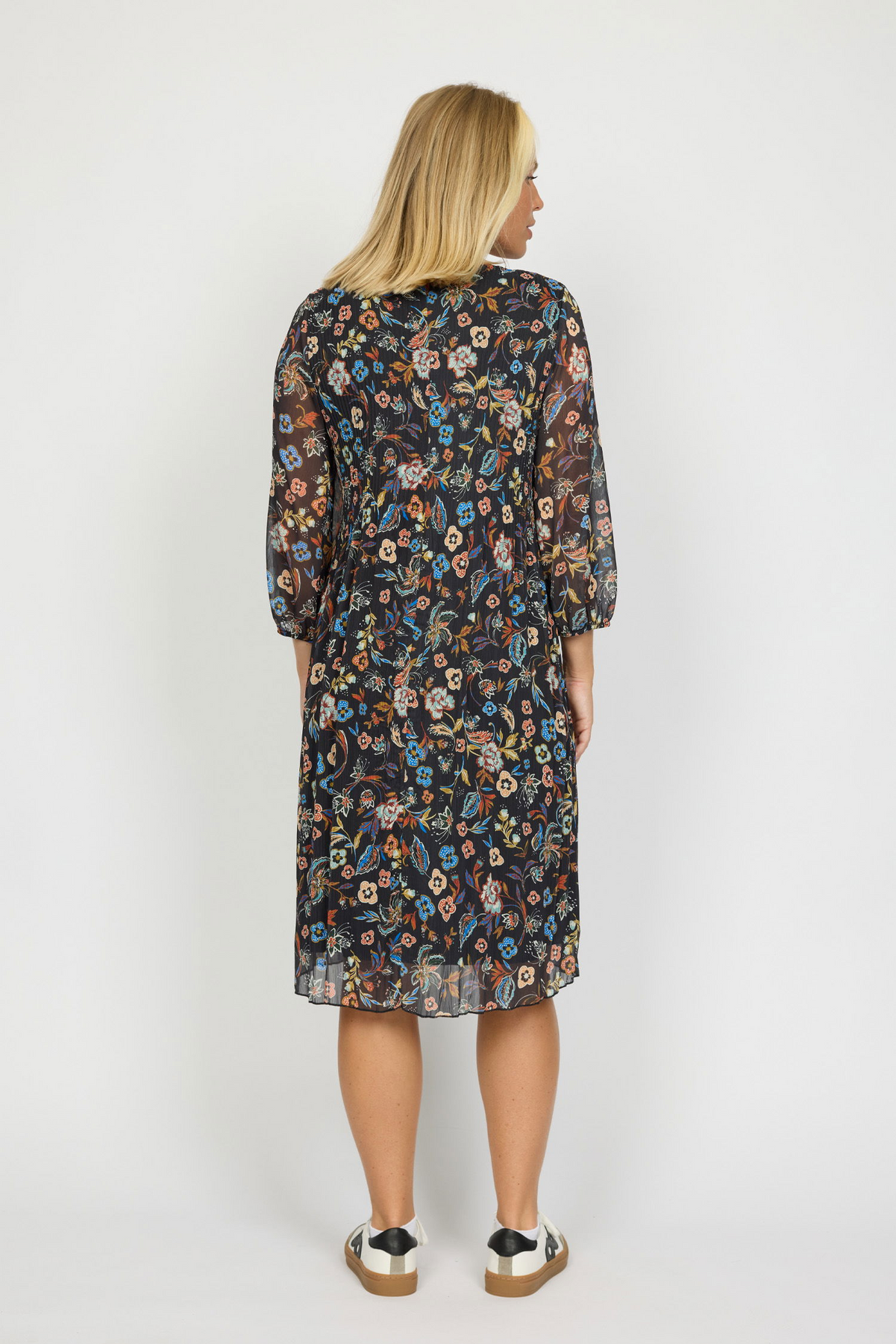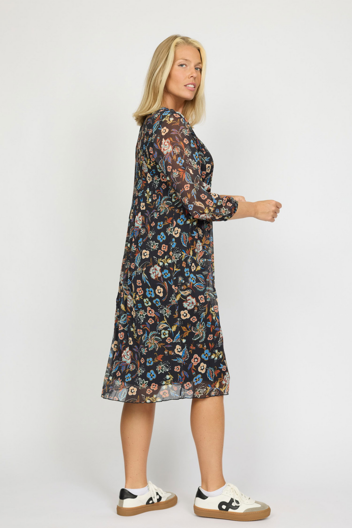 Kjolen er mørk bunn med et lekkert fargespill på plissert stoff. 3/4 dels ermlengde og knelang lengde på skjørtet. Kjolen er foret med et sort og strechy for.