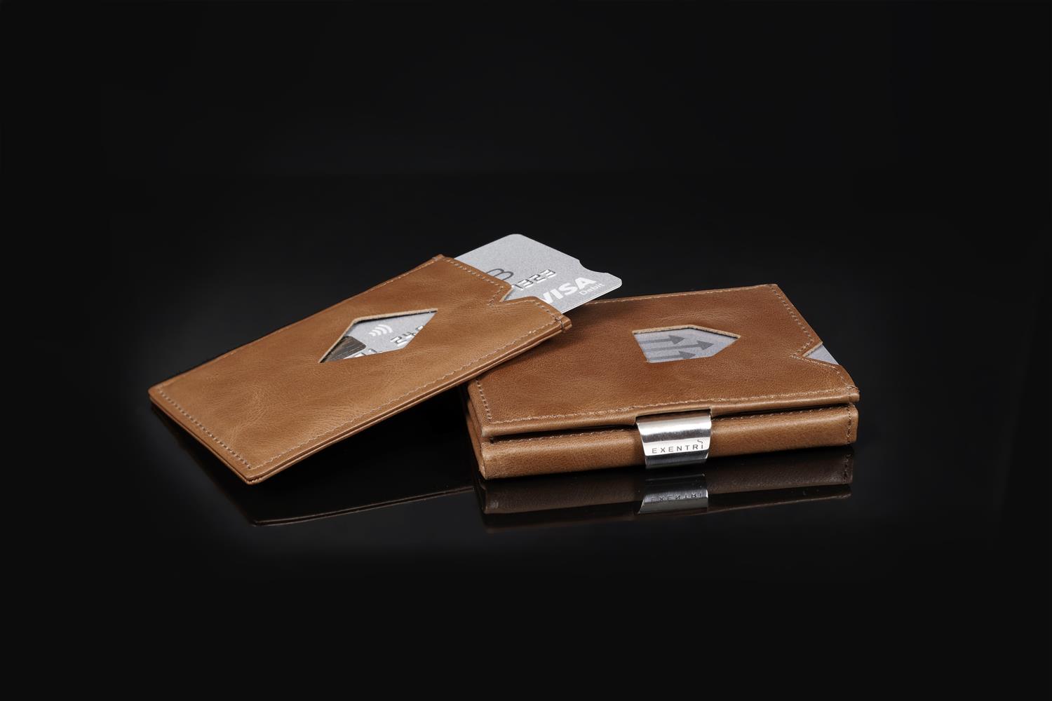 Designet for tre kort. Ekte skinn. Rustfritt stål. Leveres i elegant eske.