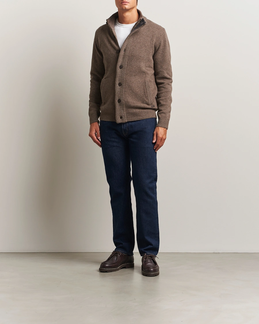 Strikket cardigan fra Barbour. Denne tykke genseren er laget av lammeull og er perfekt over både skjorter og T-skjorter. Genseren har en høy hals, alcantara-albuelapper og praktiske sidelommer foran.
